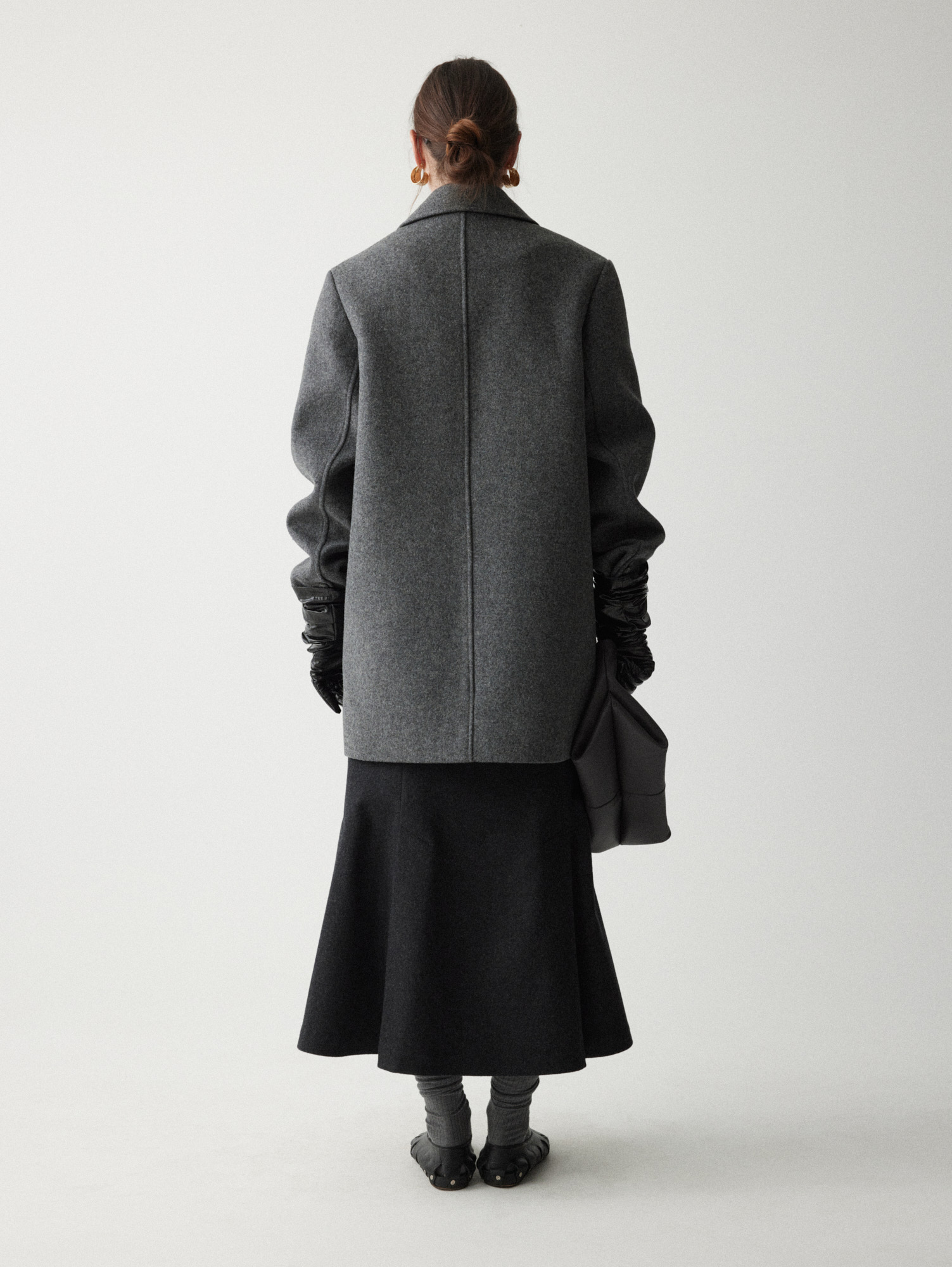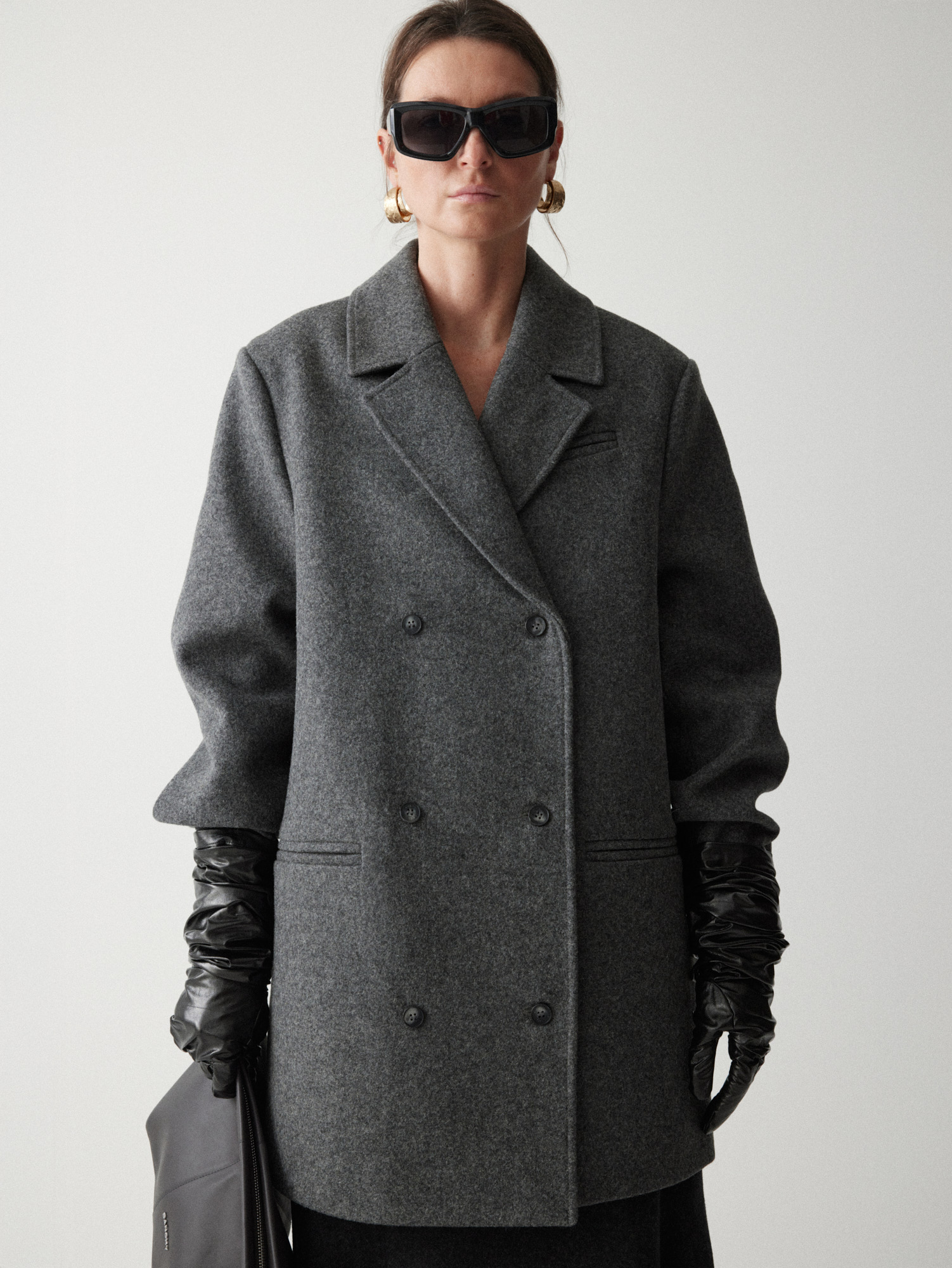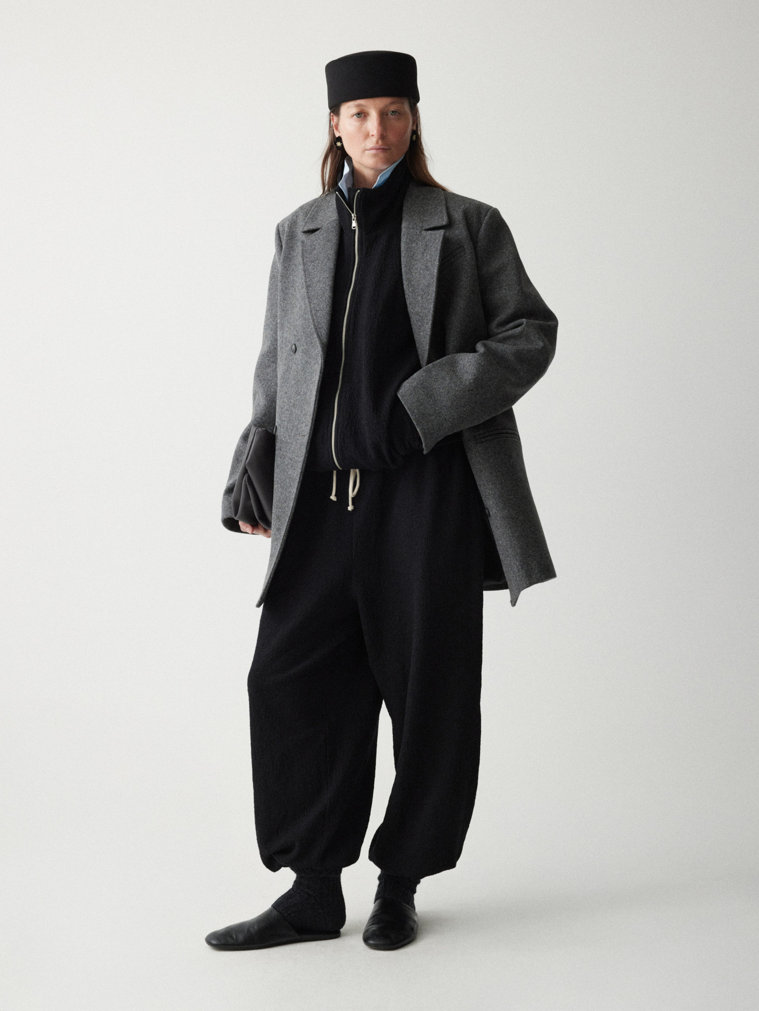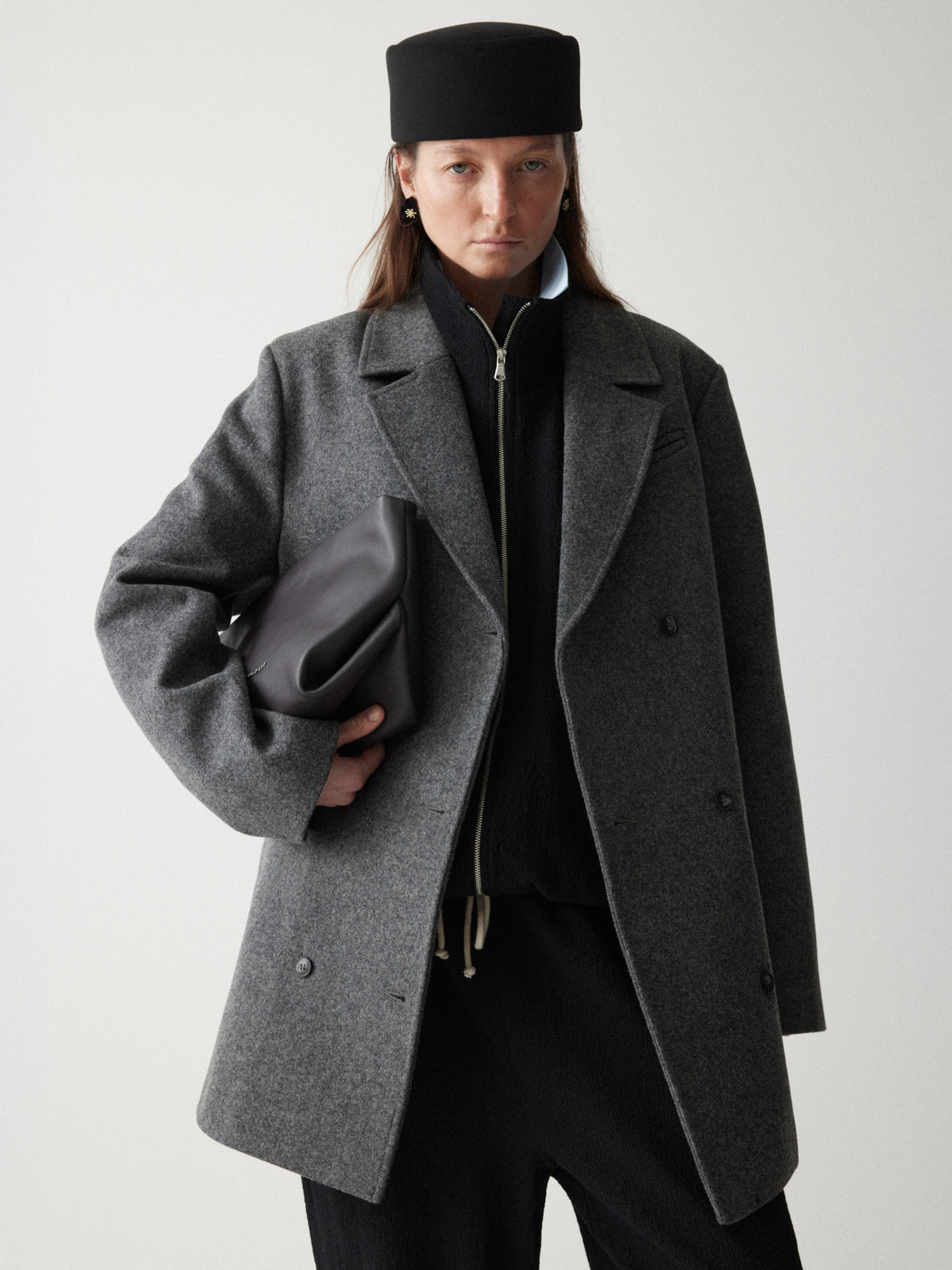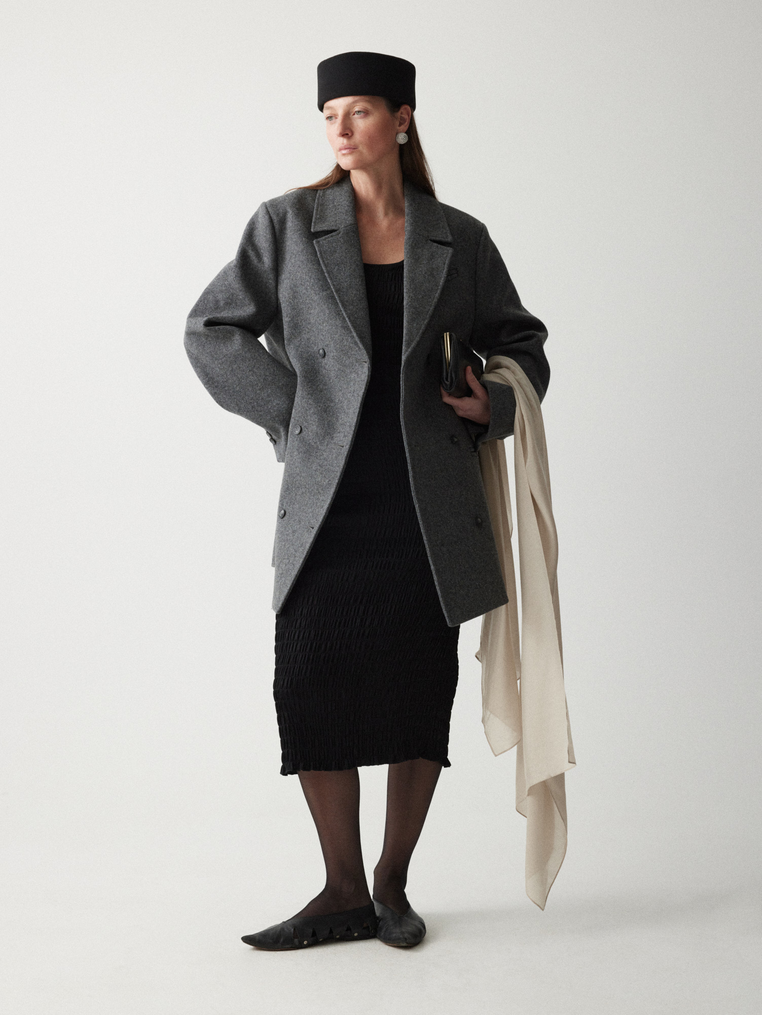 Рекомендуем стилизовать с: юбкой Senora, выполненной из того же серо-синего шерстяного материала, расслабленными джоггерами Pastor или костюмными Sarria, а также играть на контрастах силуэтов, завершая прилегающее платье Slim объемным кейпом.