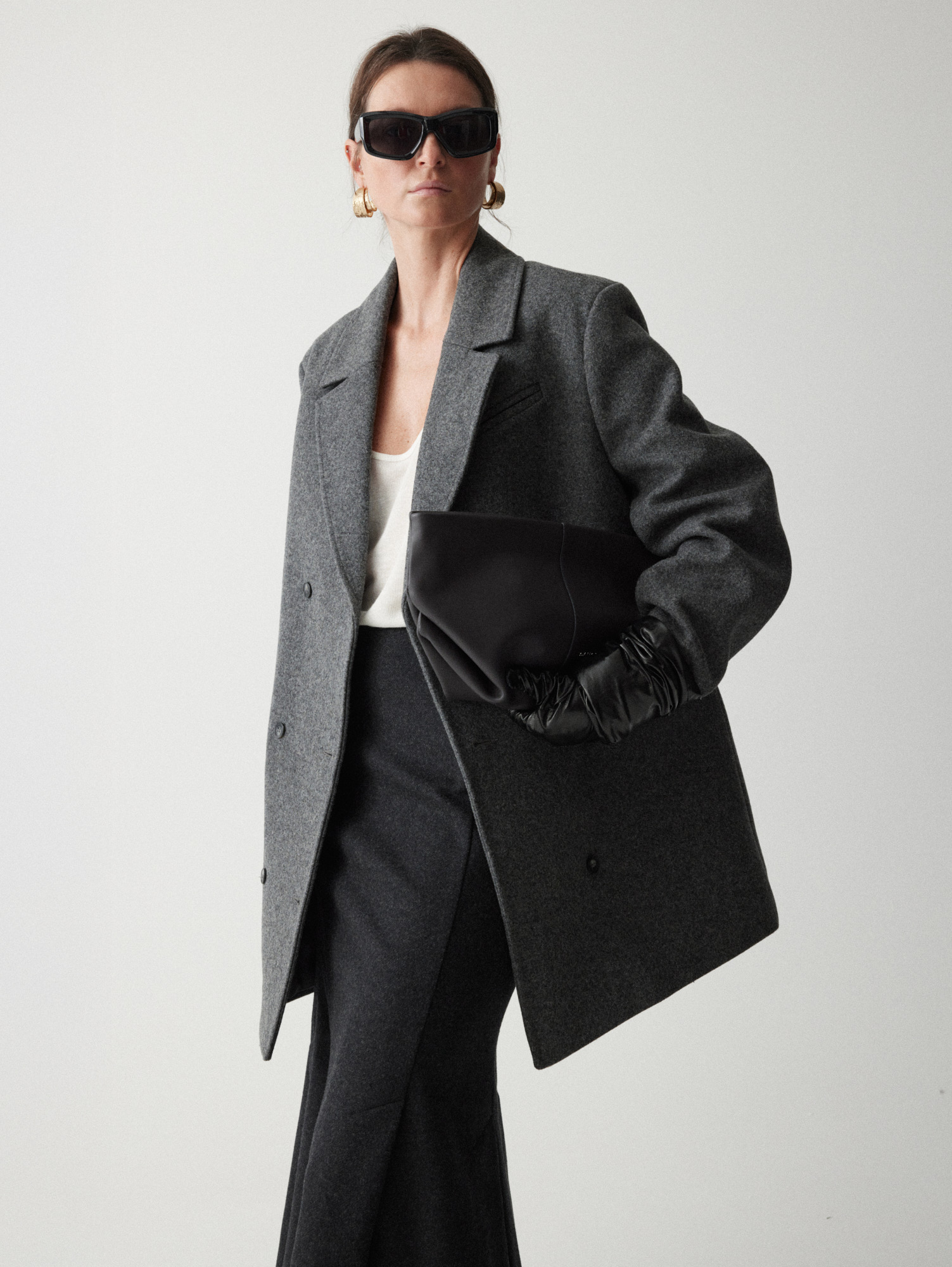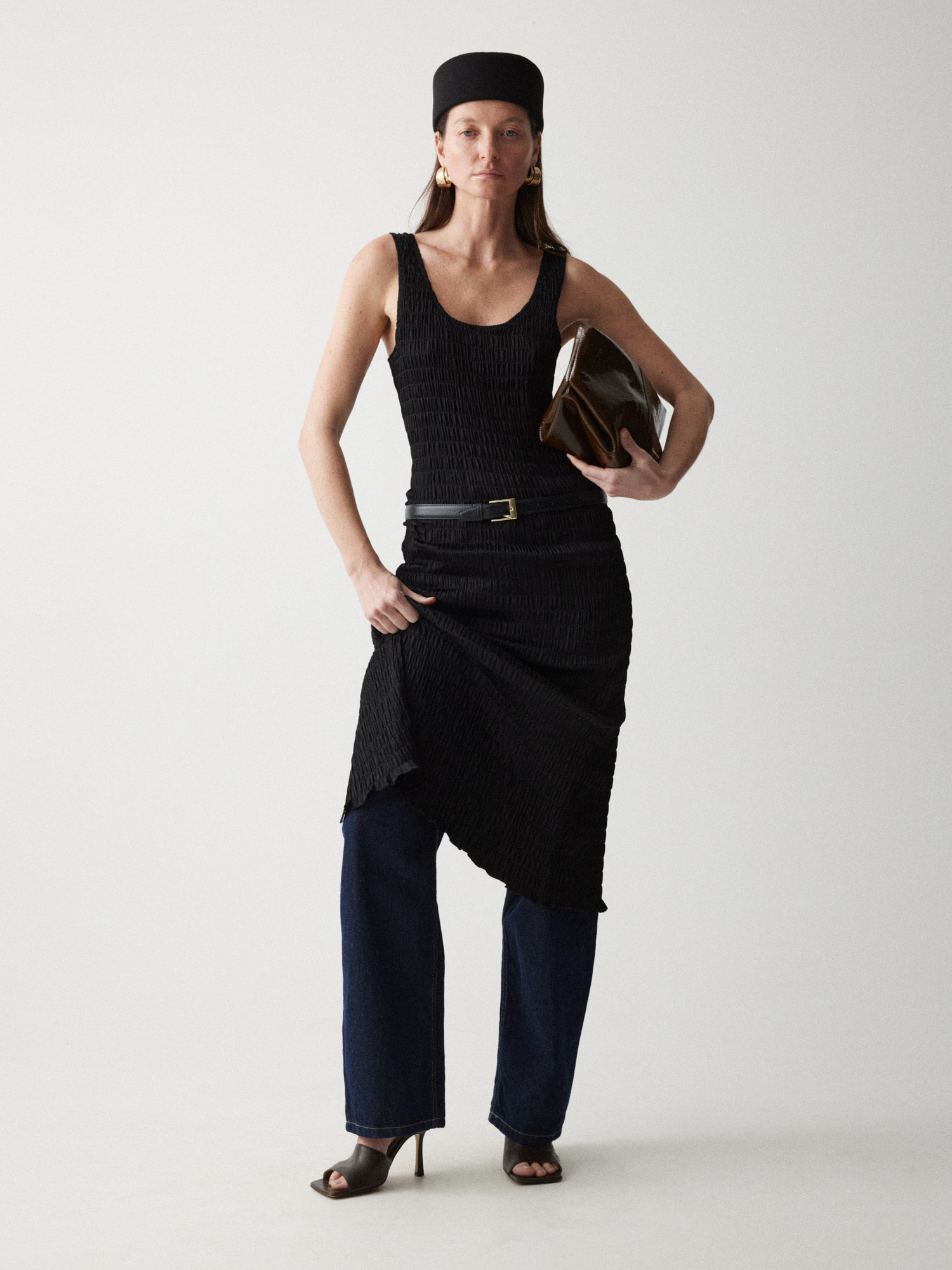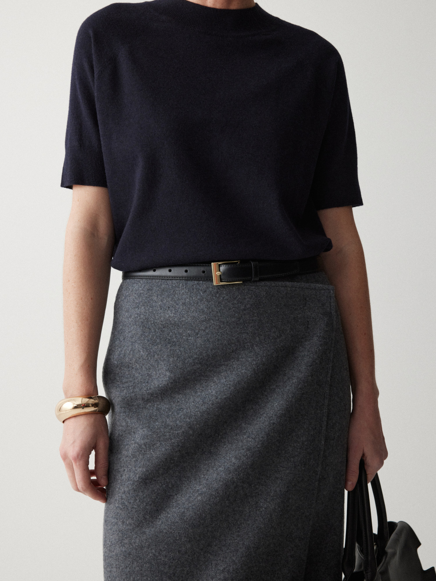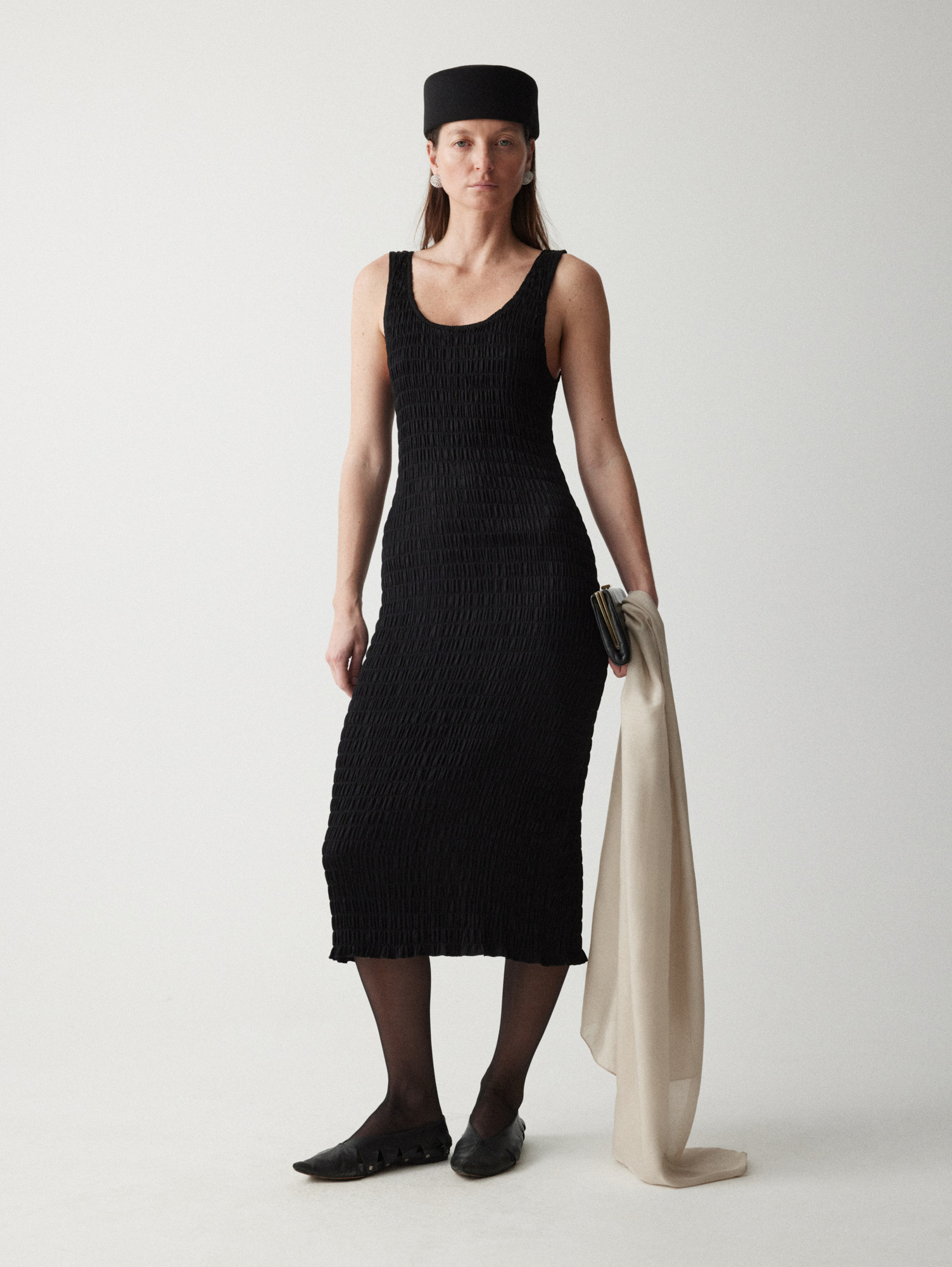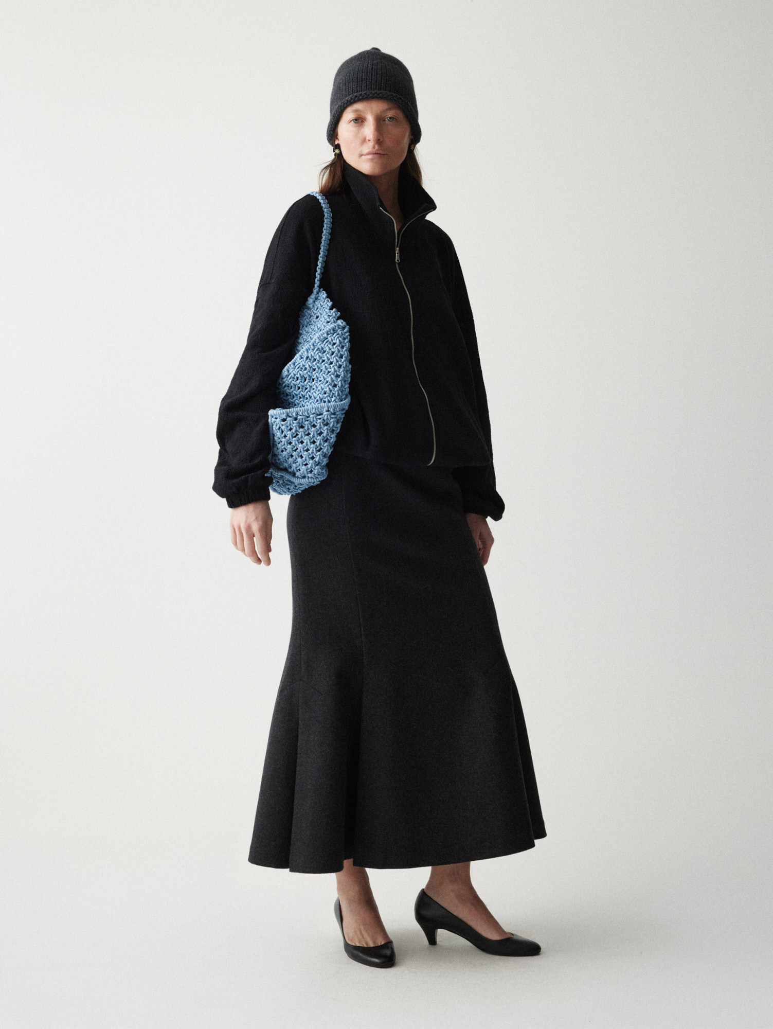 Рекомендуем стилизовать с: юбкой Senora, выполненной из того же серо-синего шерстяного материала, расслабленными джоггерами Pastor или костюмными Sarria, а также играть на контрастах силуэтов, завершая прилегающее платье Slim объемным кейпом.
