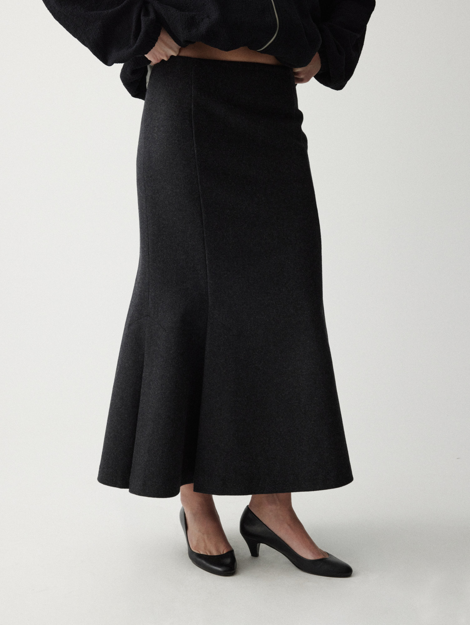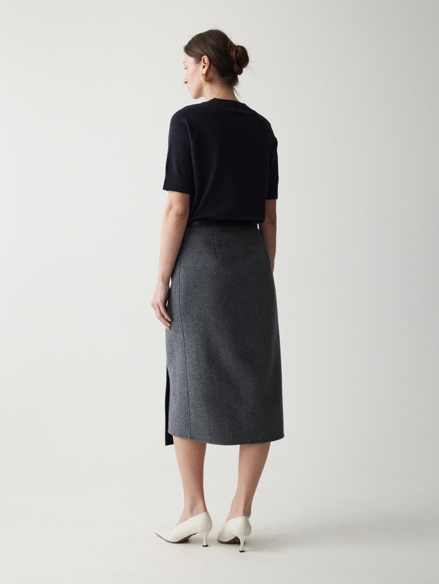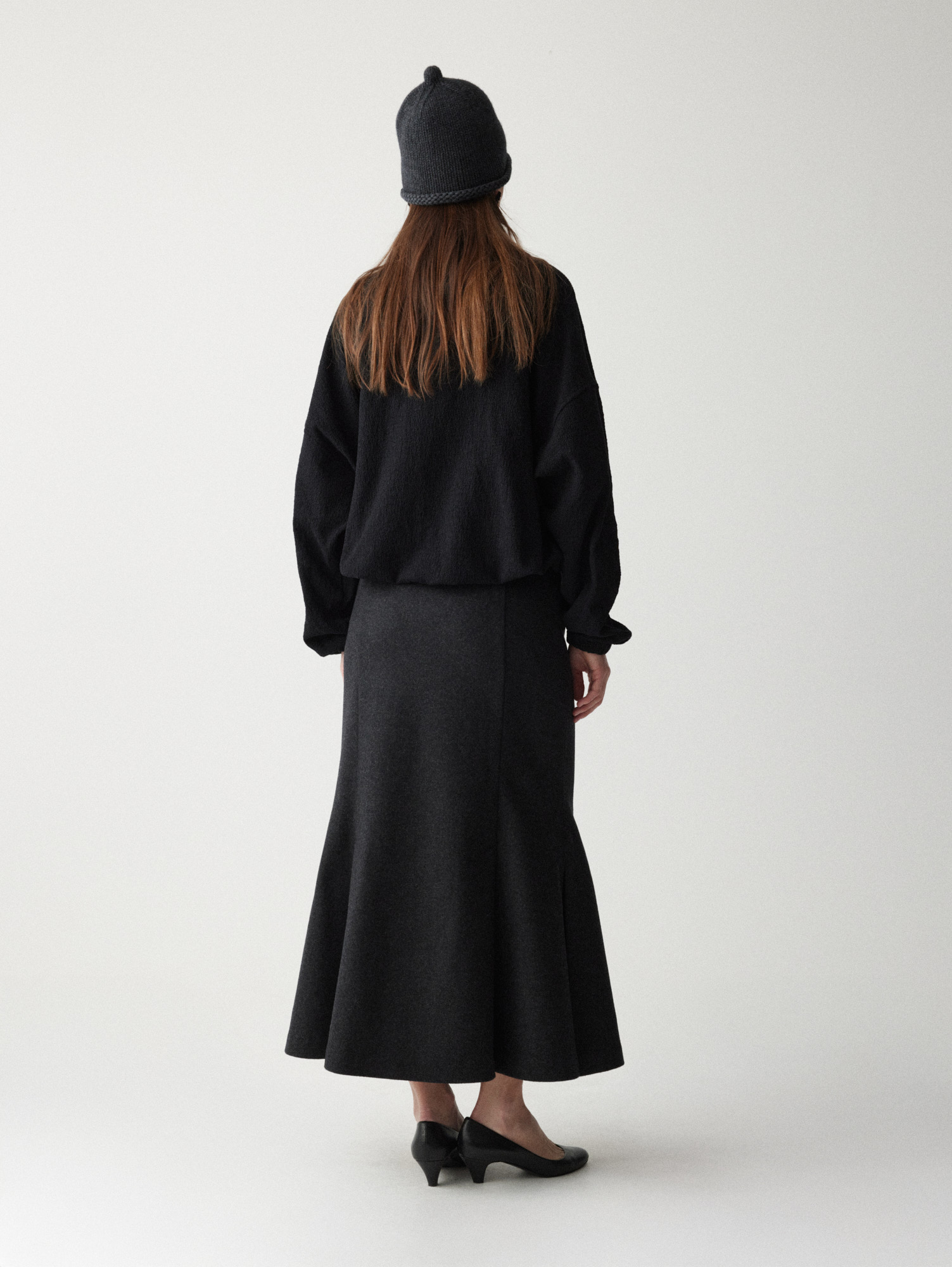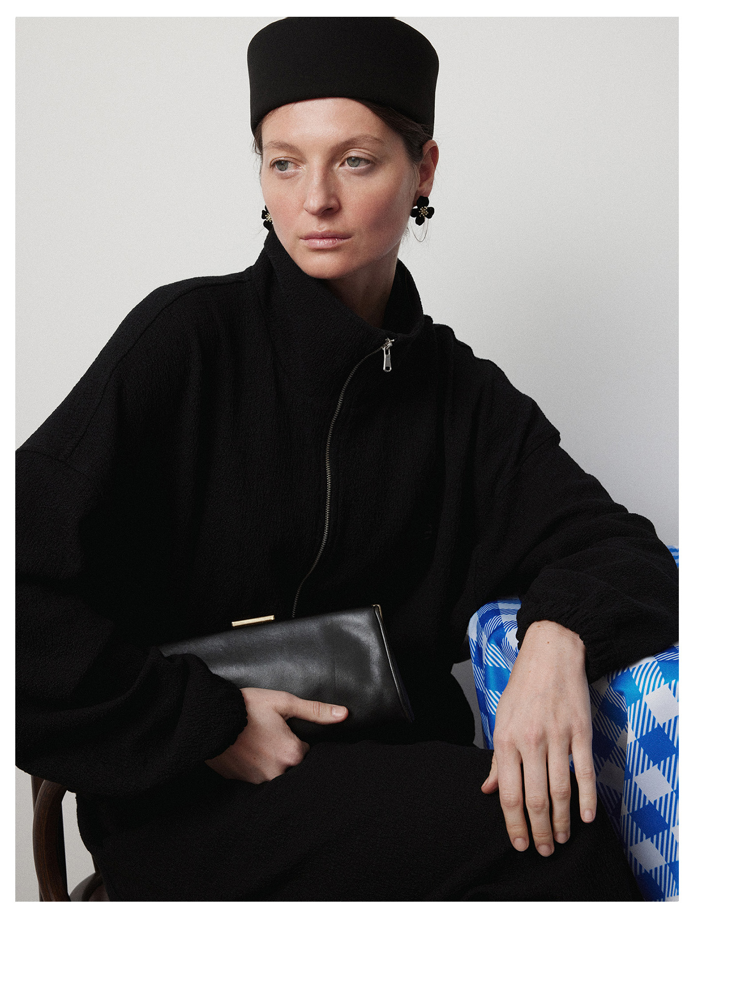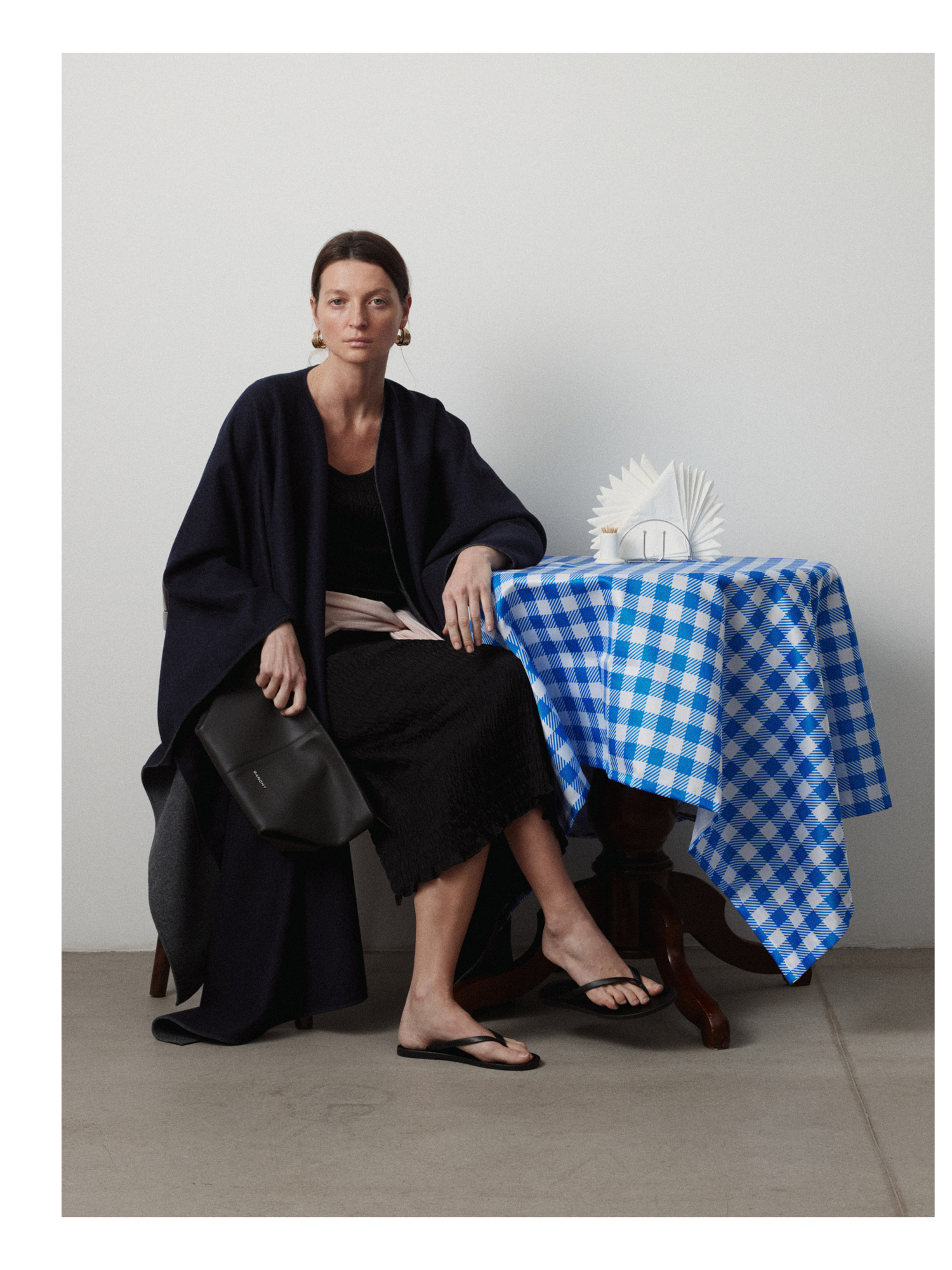 Рекомендуем стилизовать с: юбкой Senora, выполненной из того же серо-синего шерстяного материала, расслабленными джоггерами Pastor или костюмными Sarria, а также играть на контрастах силуэтов, завершая прилегающее платье Slim объемным кейпом.