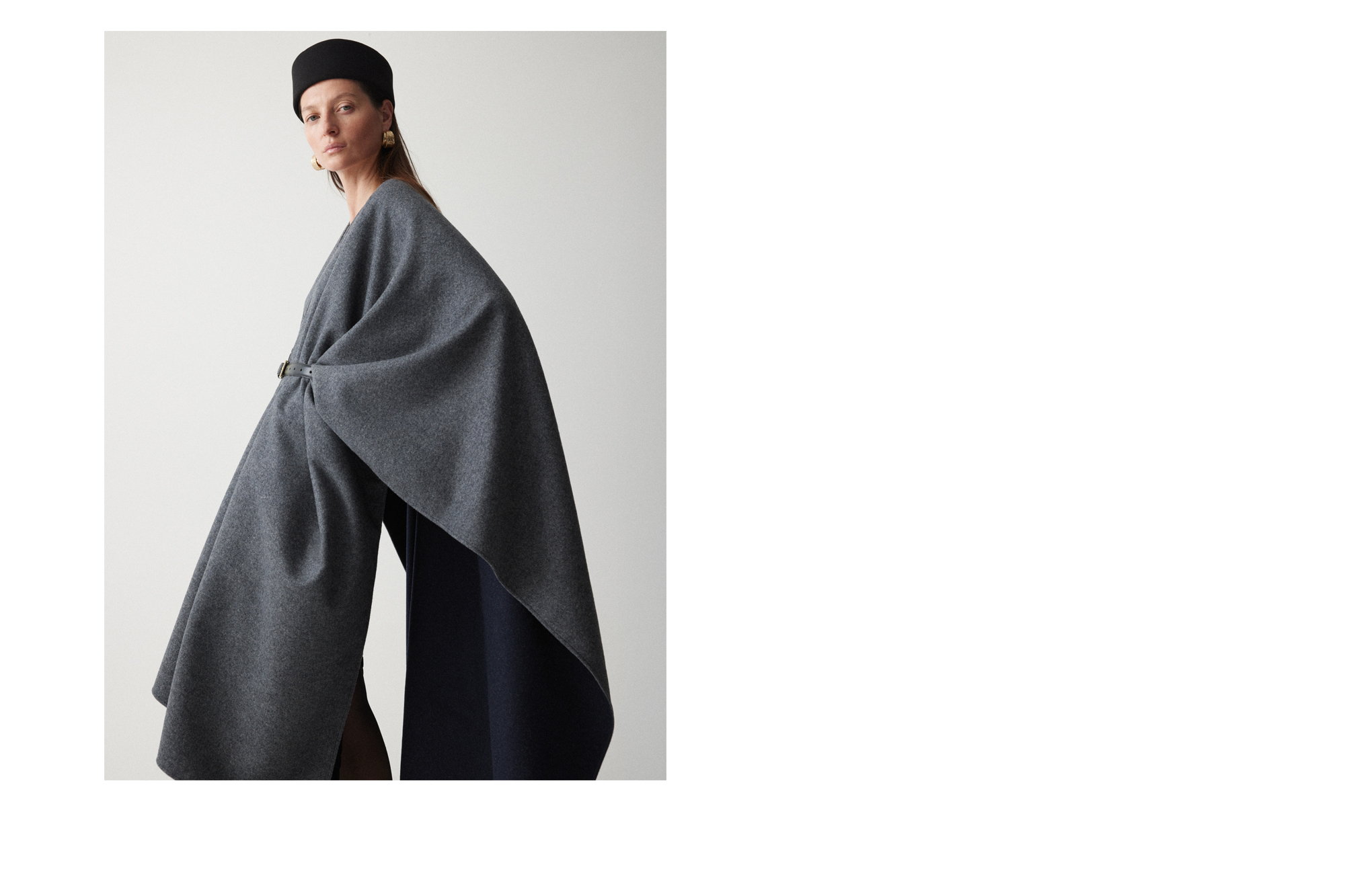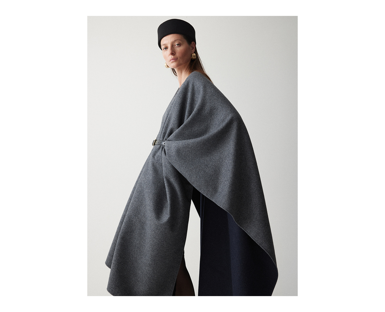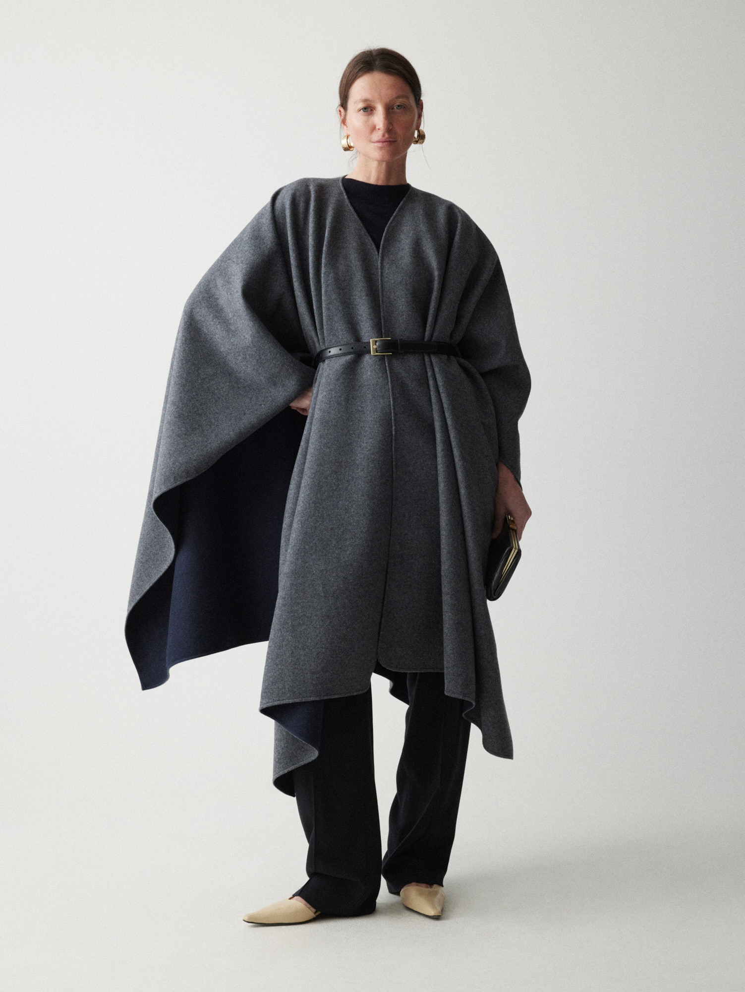 Двусторонняя накидка-кейп из мягкой virgin wool — высококачественной шерсти, не подвергавшейся переработке. Внешняя сторона серого оттенка, внутренняя — темно-синего, меняйте их в зависимости от настроения образа, раскрывая потенциал кейпа.