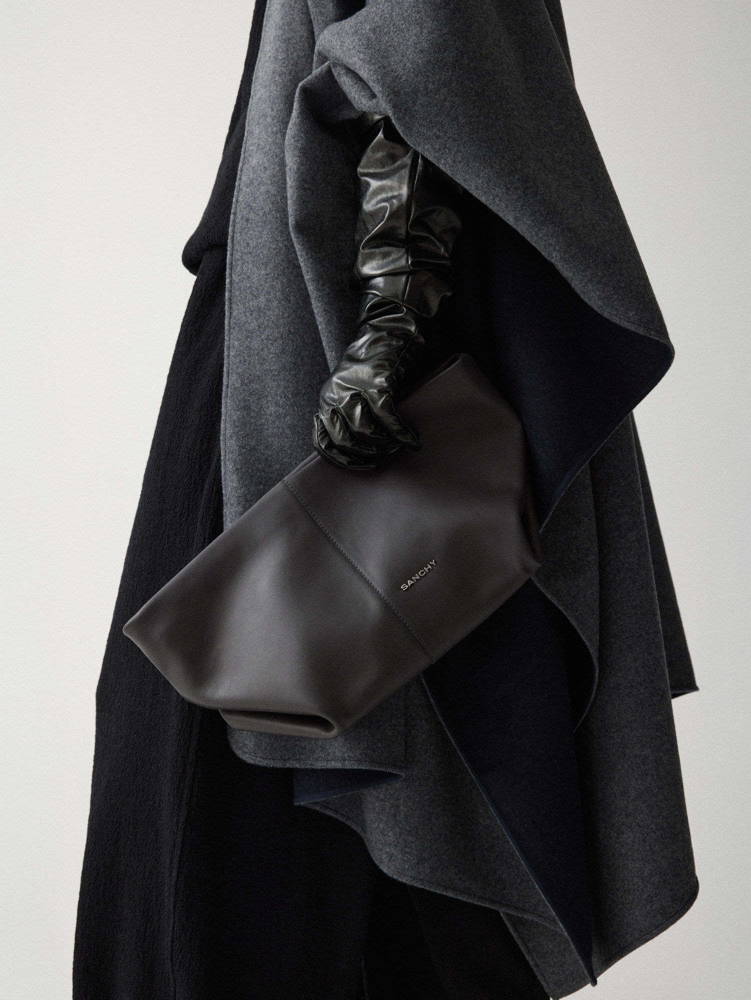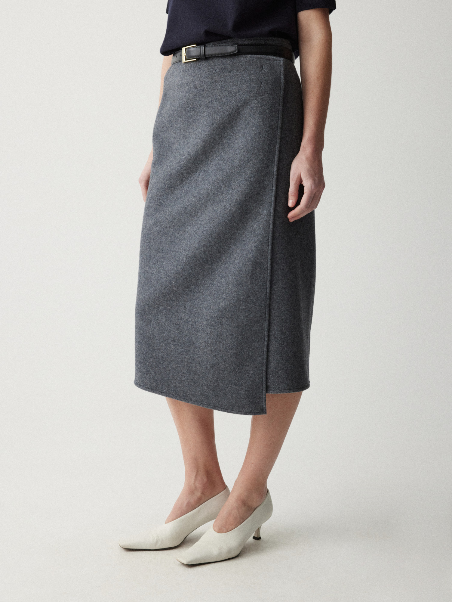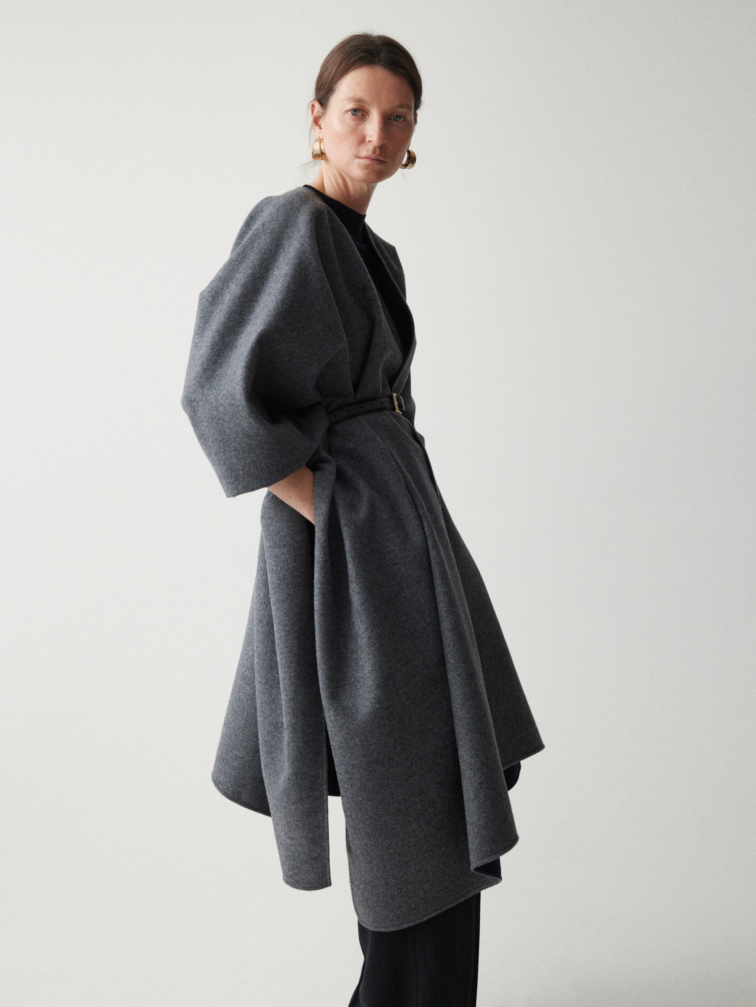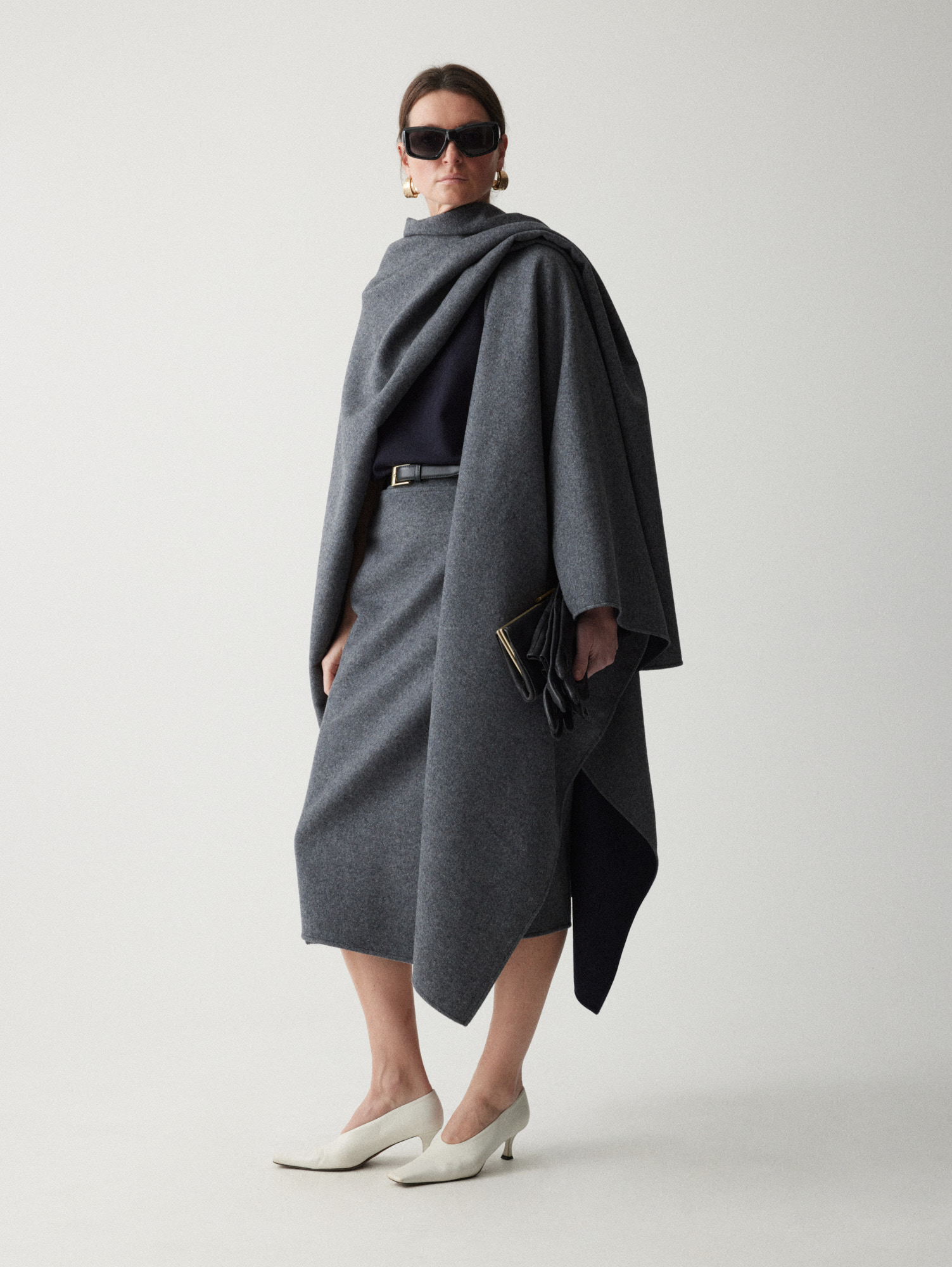Двусторонняя накидка-кейп из мягкой virgin wool — высококачественной шерсти, не подвергавшейся переработке. Внешняя сторона серого оттенка, внутренняя — темно-синего, меняйте их в зависимости от настроения образа, раскрывая потенциал кейпа.