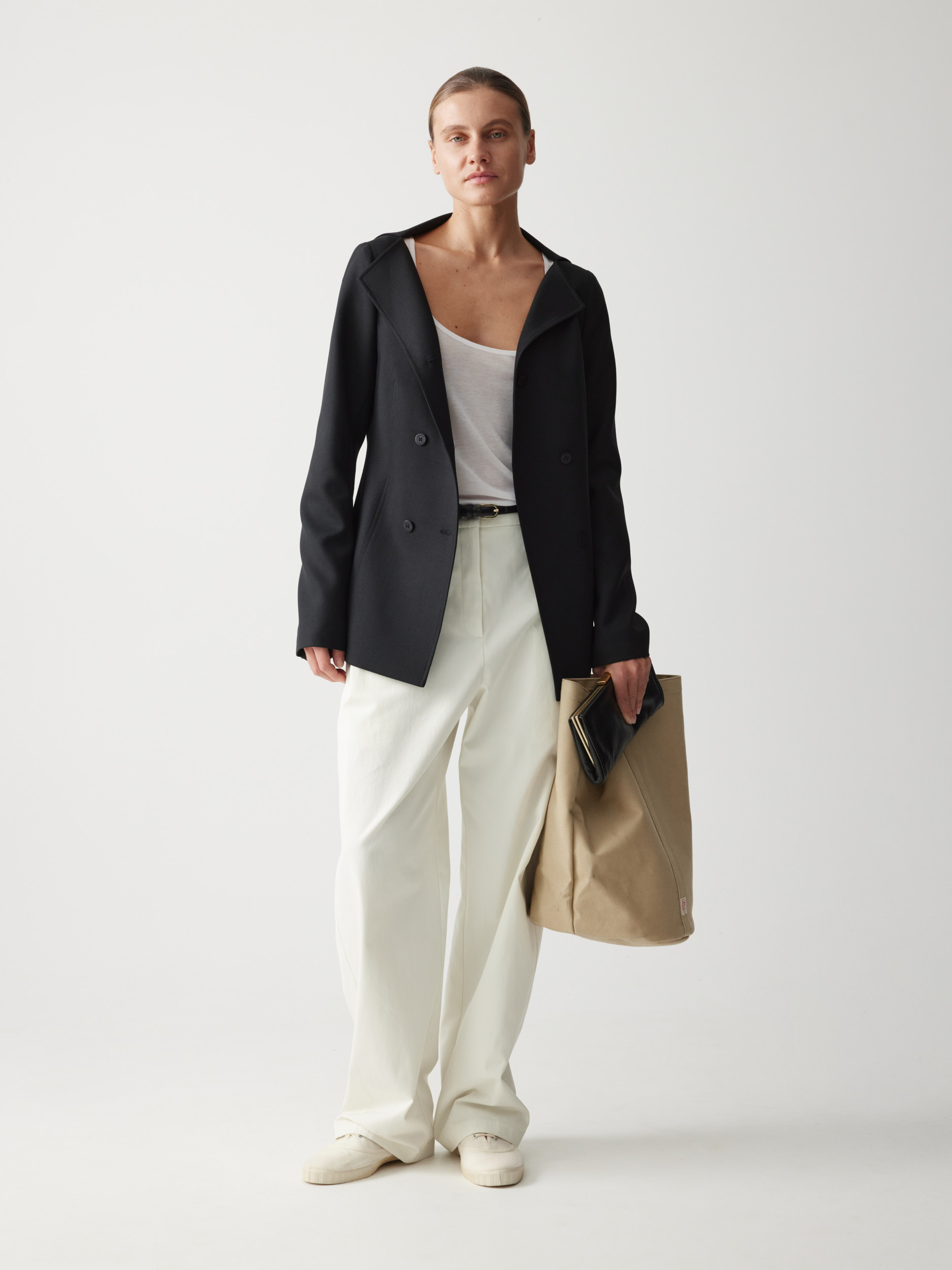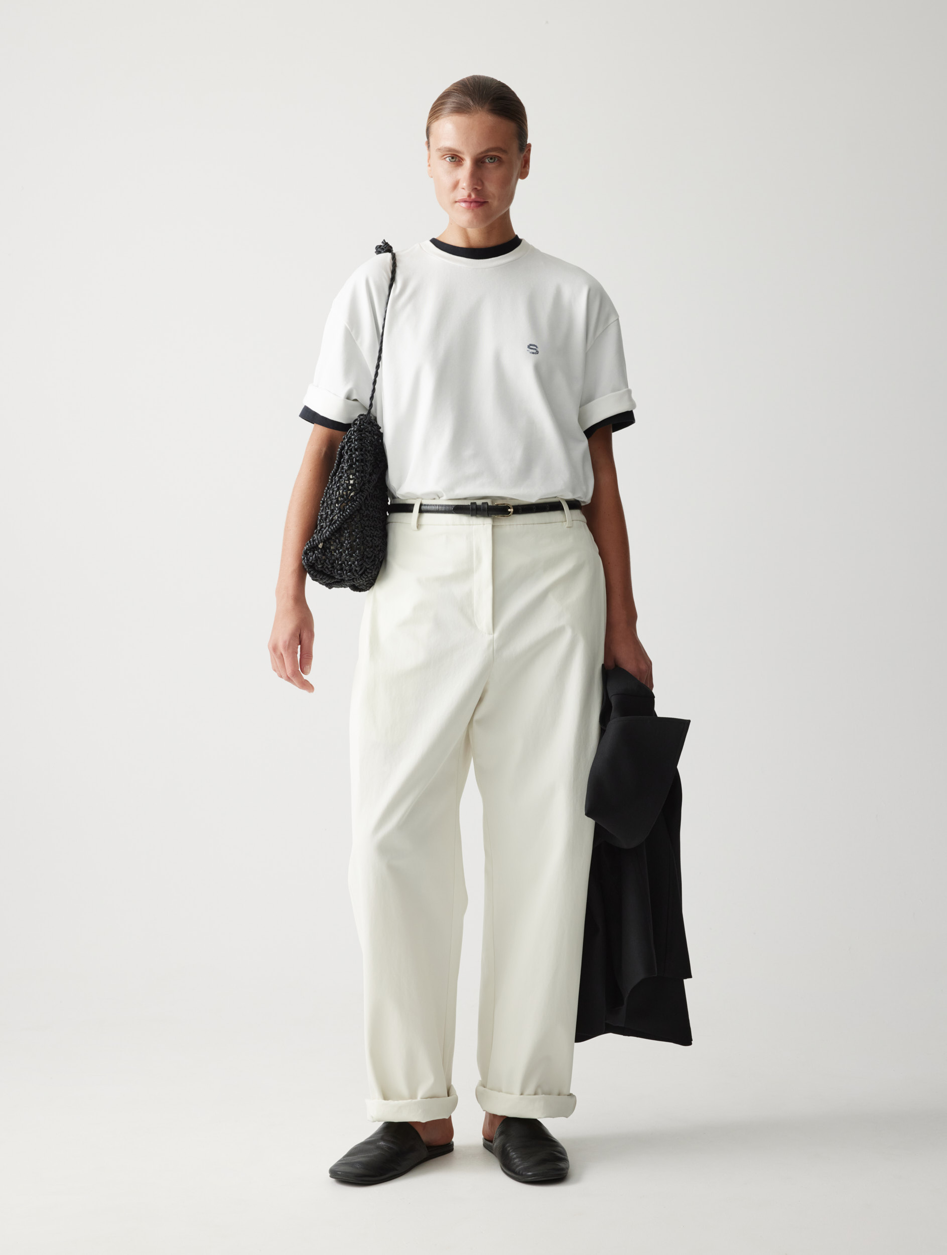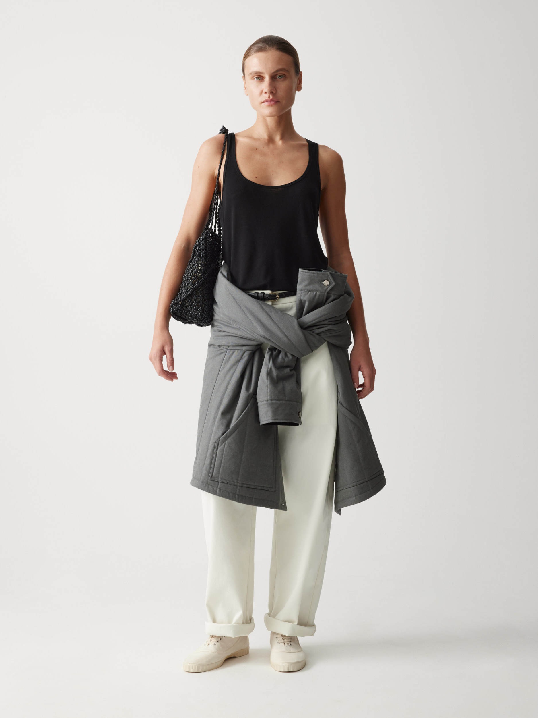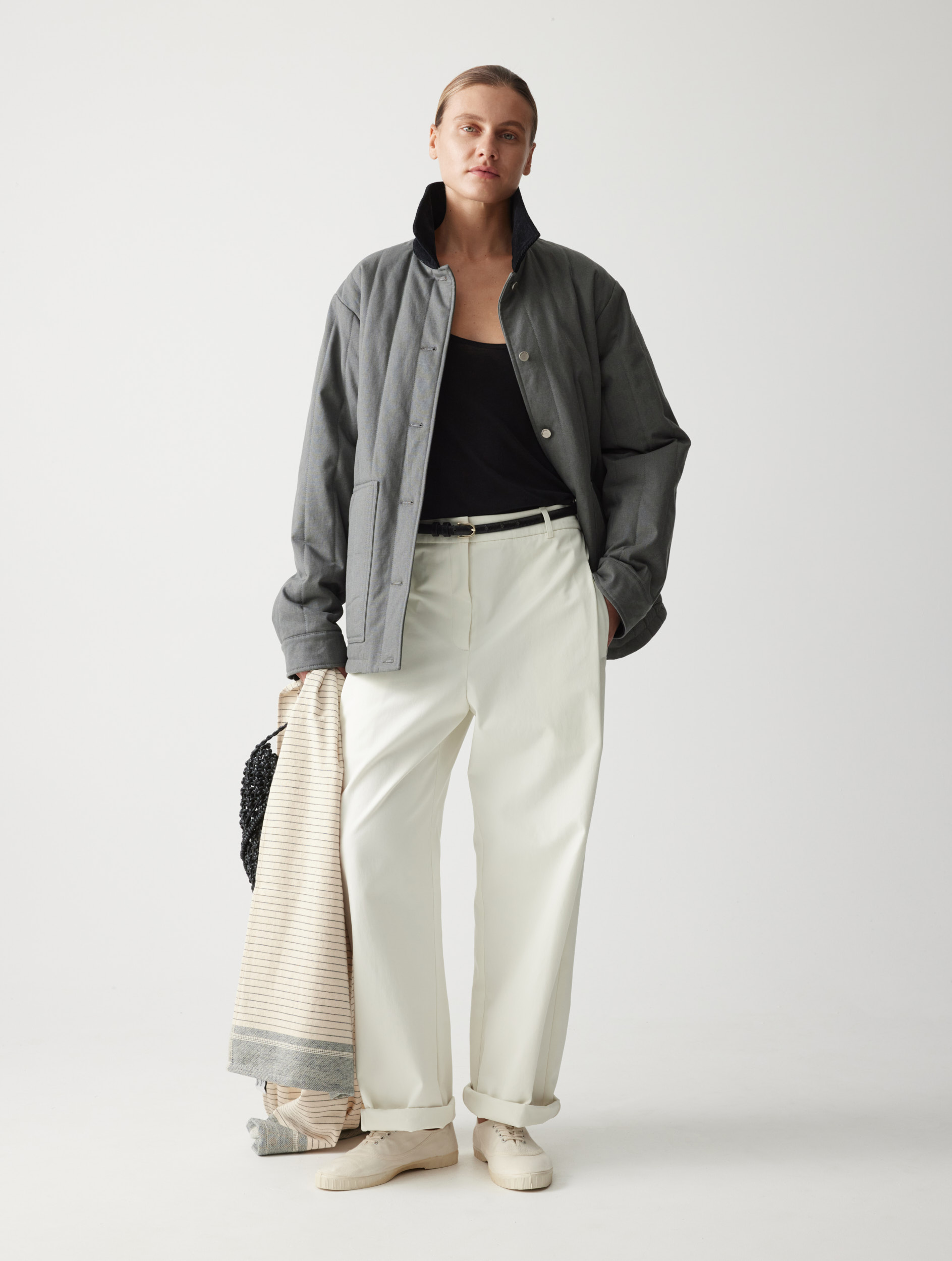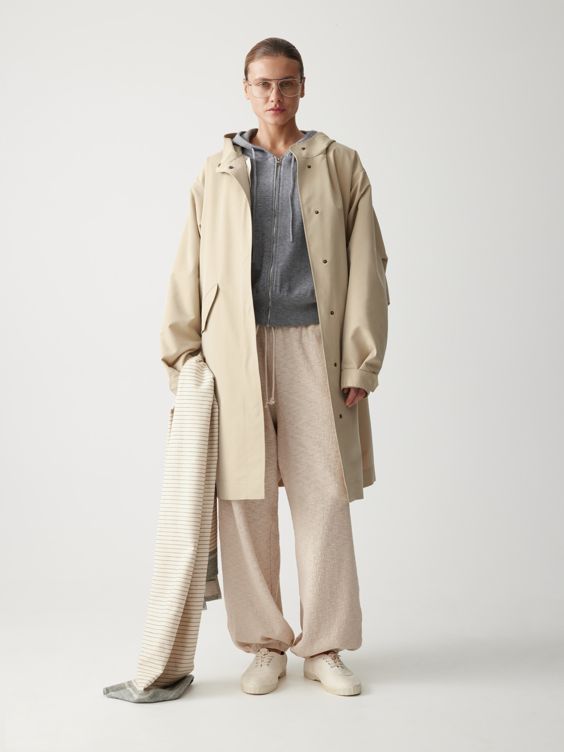 Рекомендуем сочетать с различными изделиями — от расслабленных костюмных брюк и фактурных джоггеров до женственных юбок. Плащ легко интегрируется в разные образы.