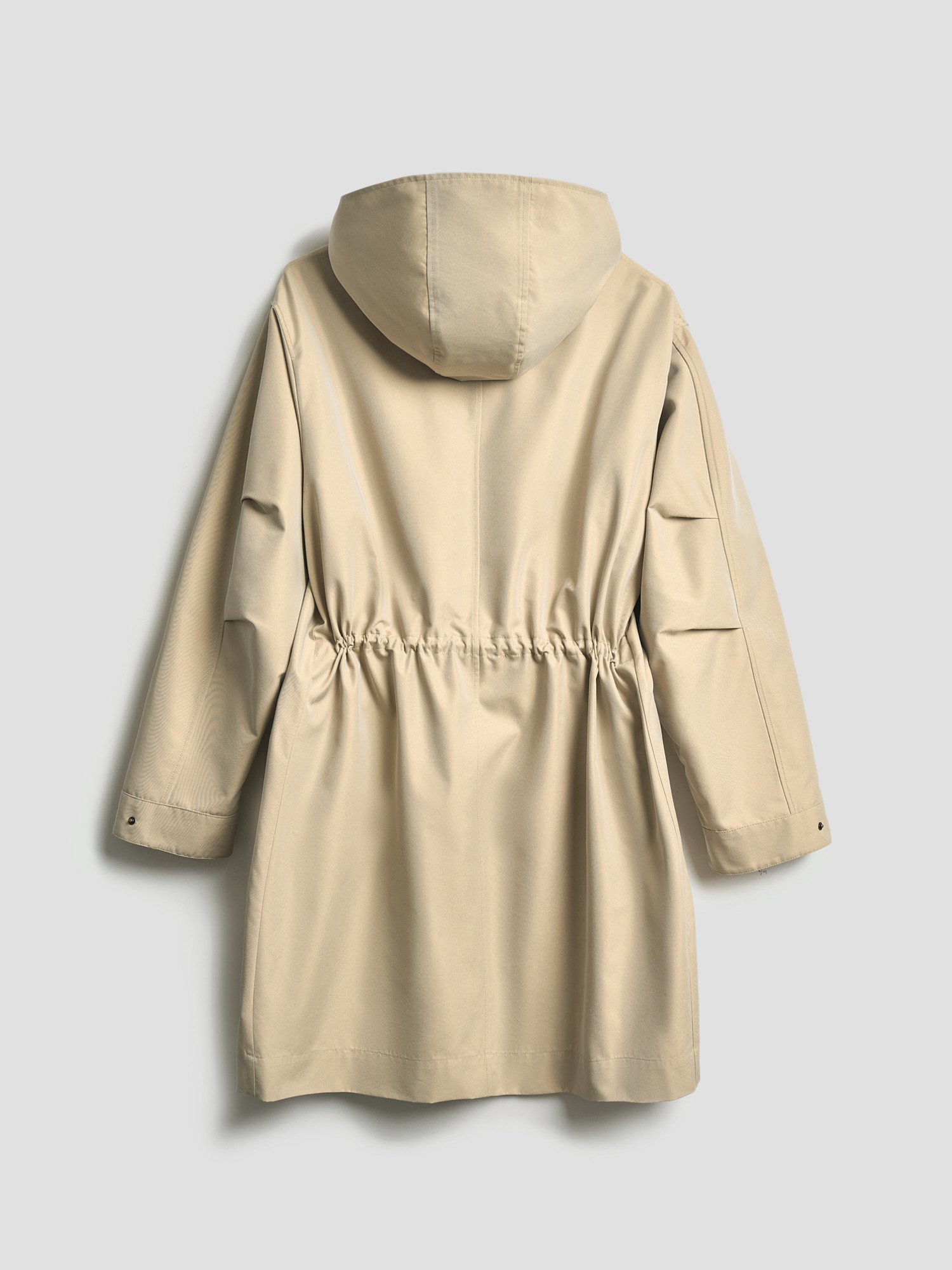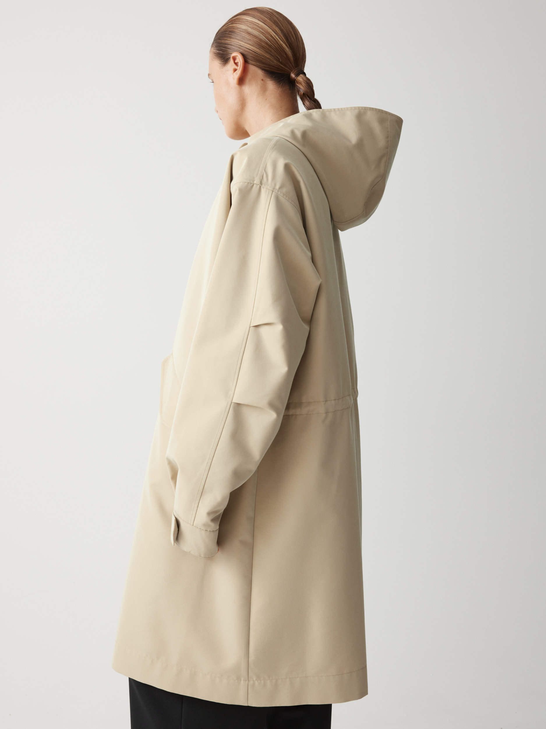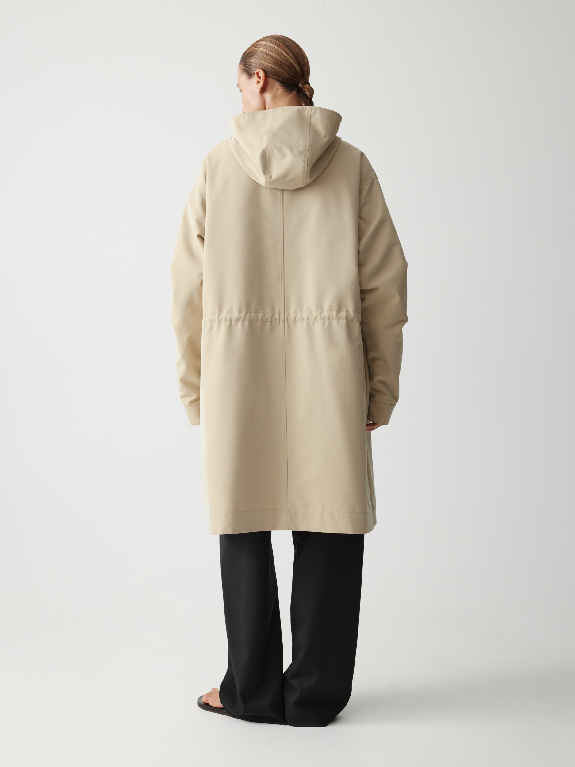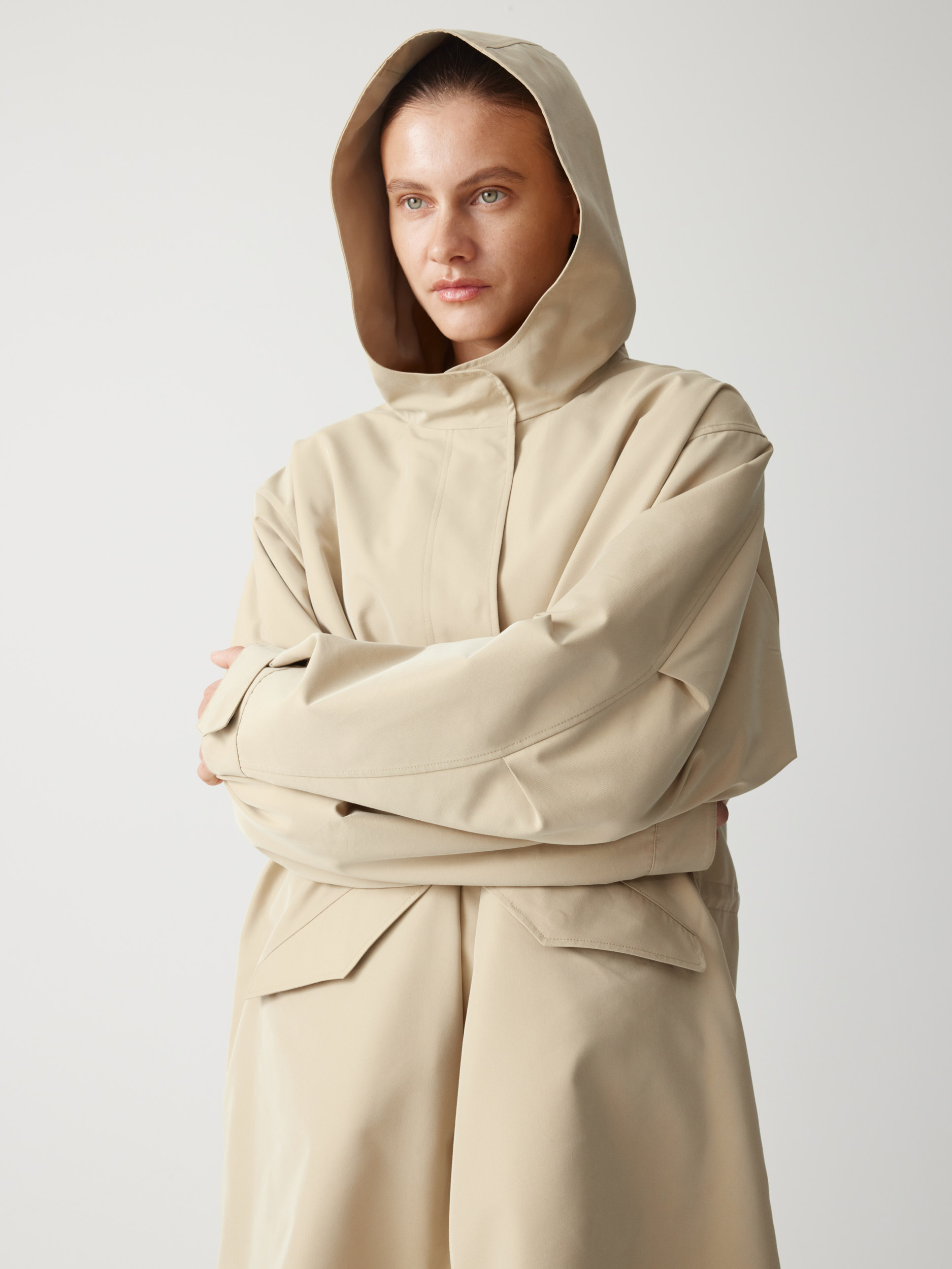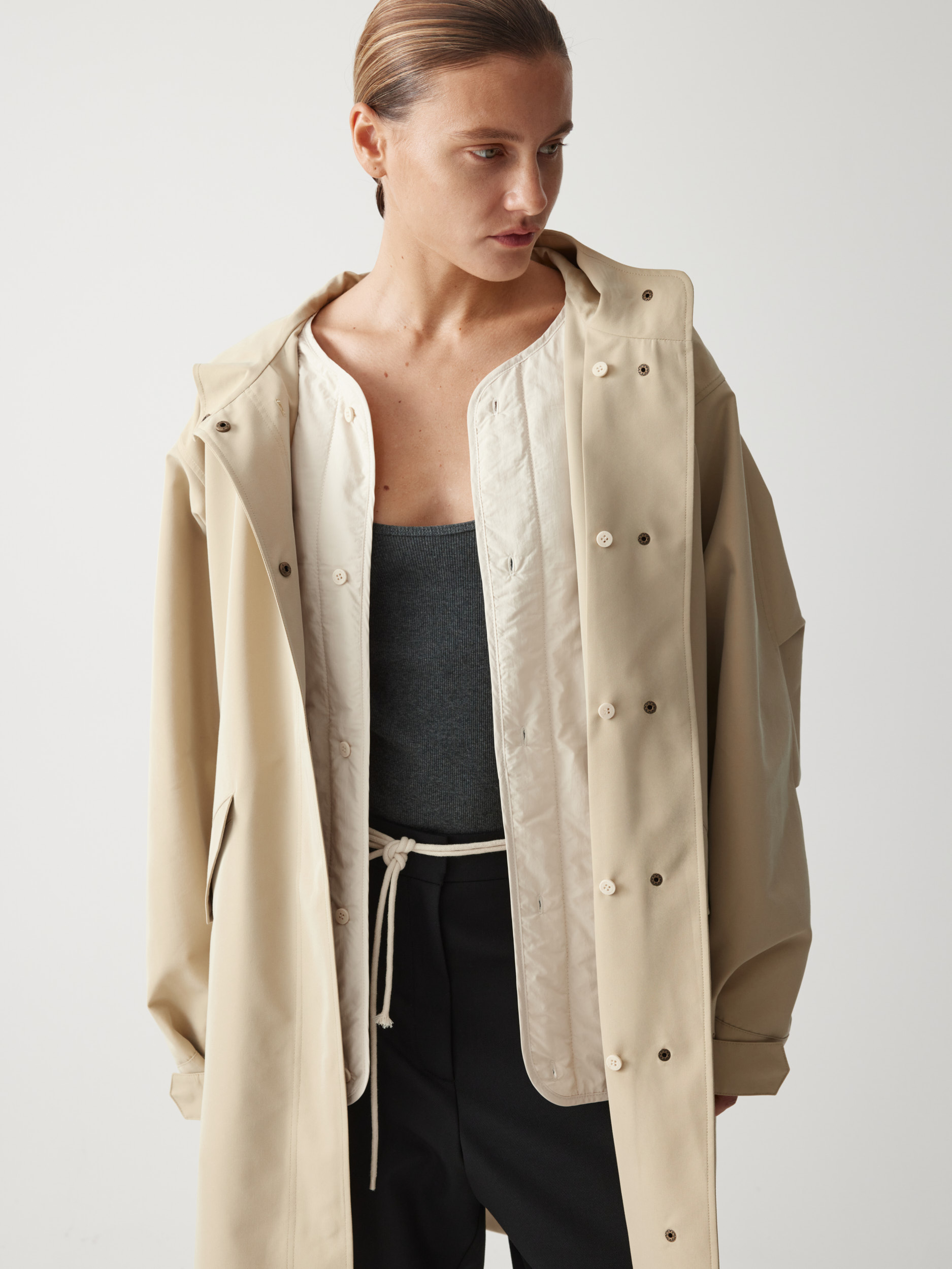 Прямой объемный силуэт позволяет создавать теплую многослойность, а капюшон и скрытая застежка на кнопки защищают от непогоды. В функциональных деталях — карманы, регулируемые манжеты и внутренняя кулиска, формирующая полуприталенный силуэт по спине.