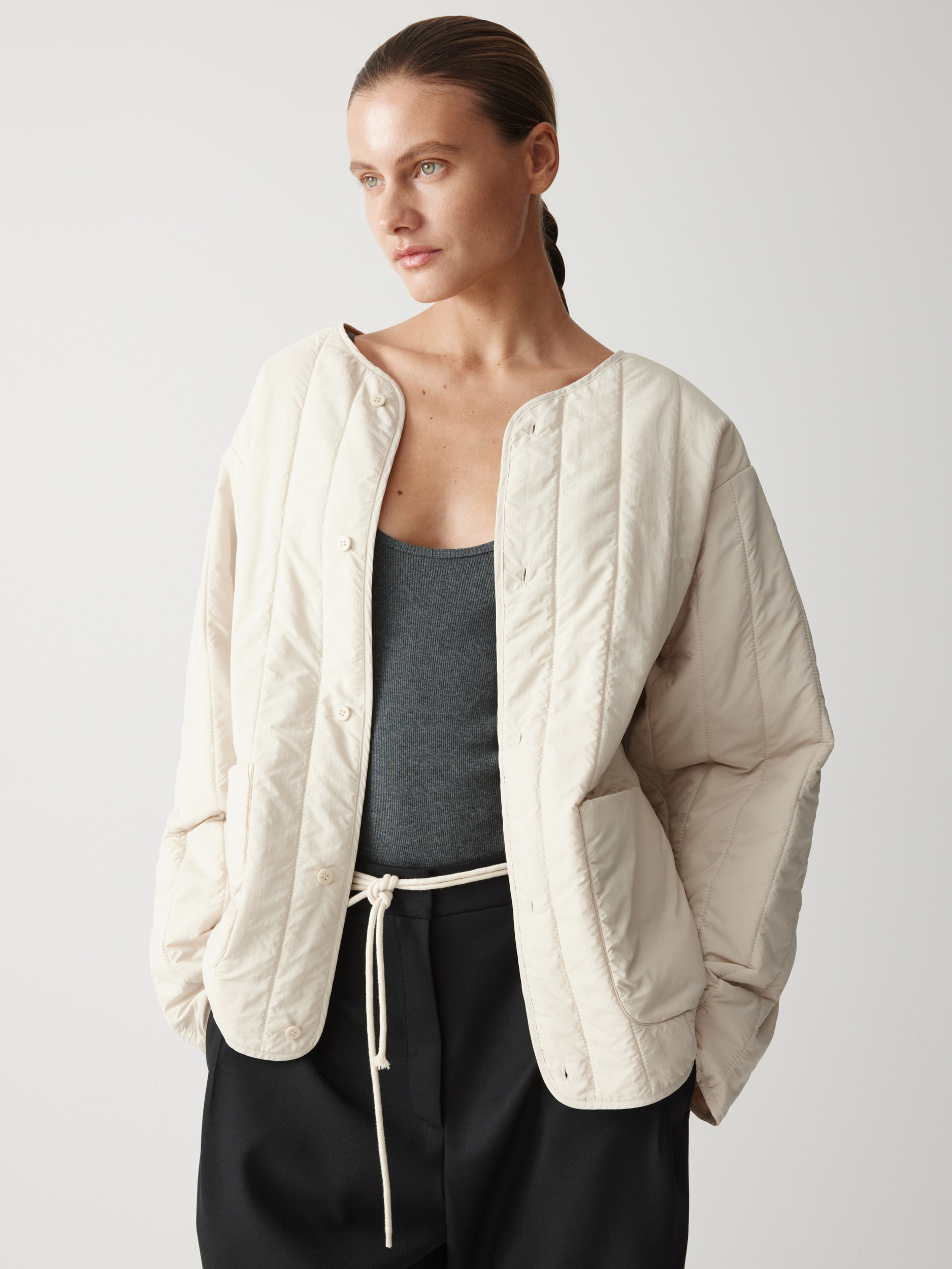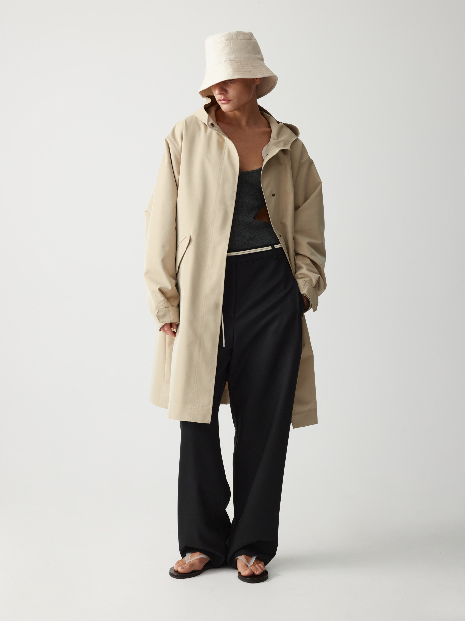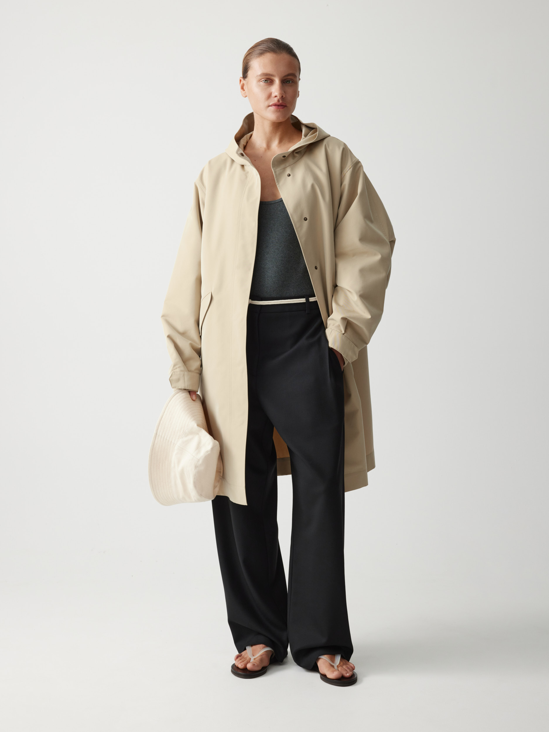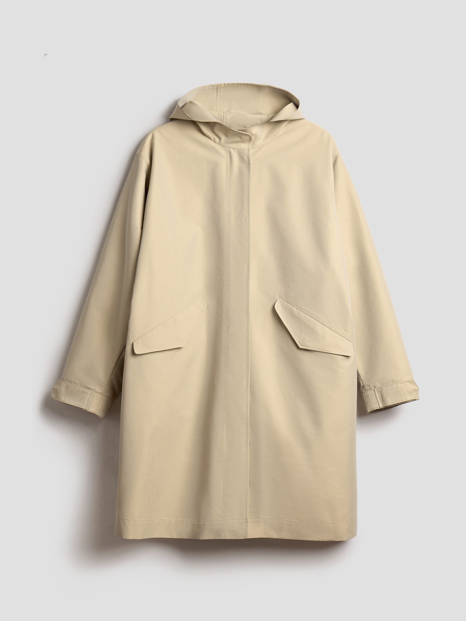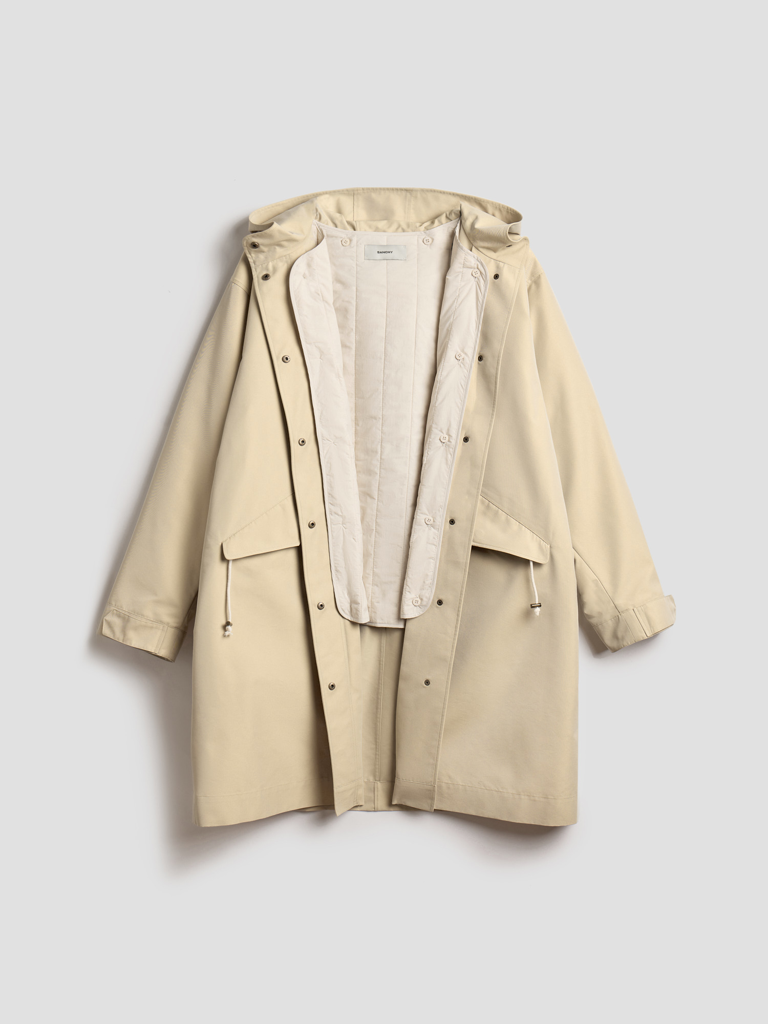 Прямой объемный силуэт позволяет создавать теплую многослойность, а капюшон и скрытая застежка на кнопки защищают от непогоды. В функциональных деталях — карманы, регулируемые манжеты и внутренняя кулиска, формирующая полуприталенный силуэт по спине.