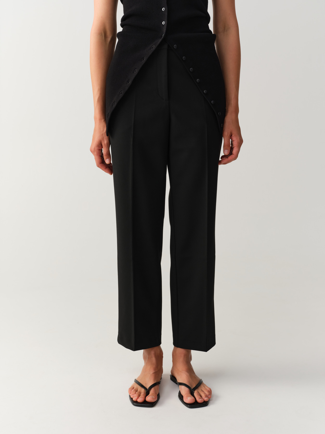 Топ бельевого типа с отделкой из итальянского кружева по глубокому вырезу и низу. Прямой силуэт, тонкие регулируемые бретели и высокий разрез в левом боковом шве.