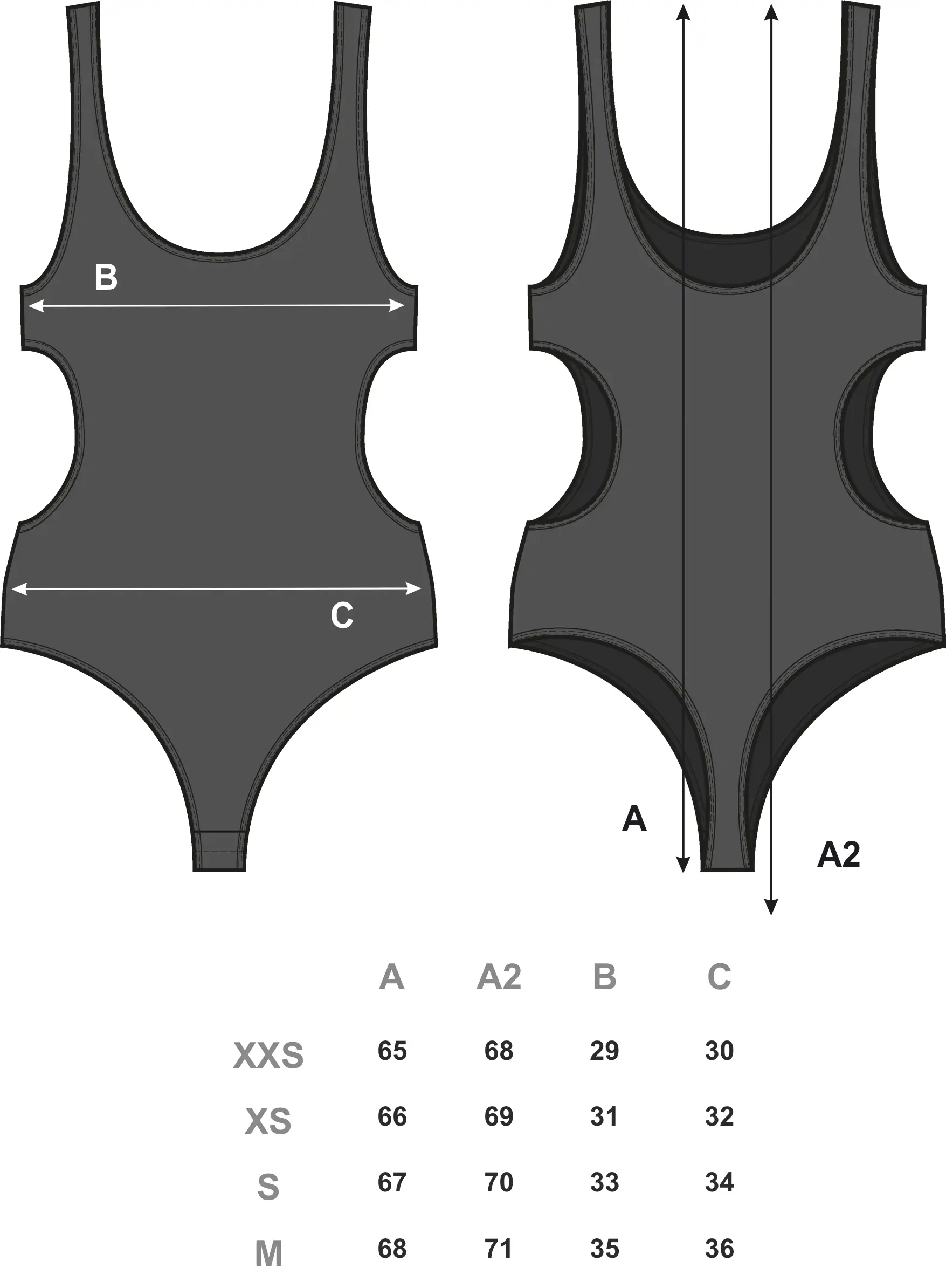 Боди фиксируется по низу тесьмой с кнопками, регулируемыми по росту — для среднего и высокого. Сзади выполнено по типу «бразилиана», обеспечивающему минимальное пролегание швов.