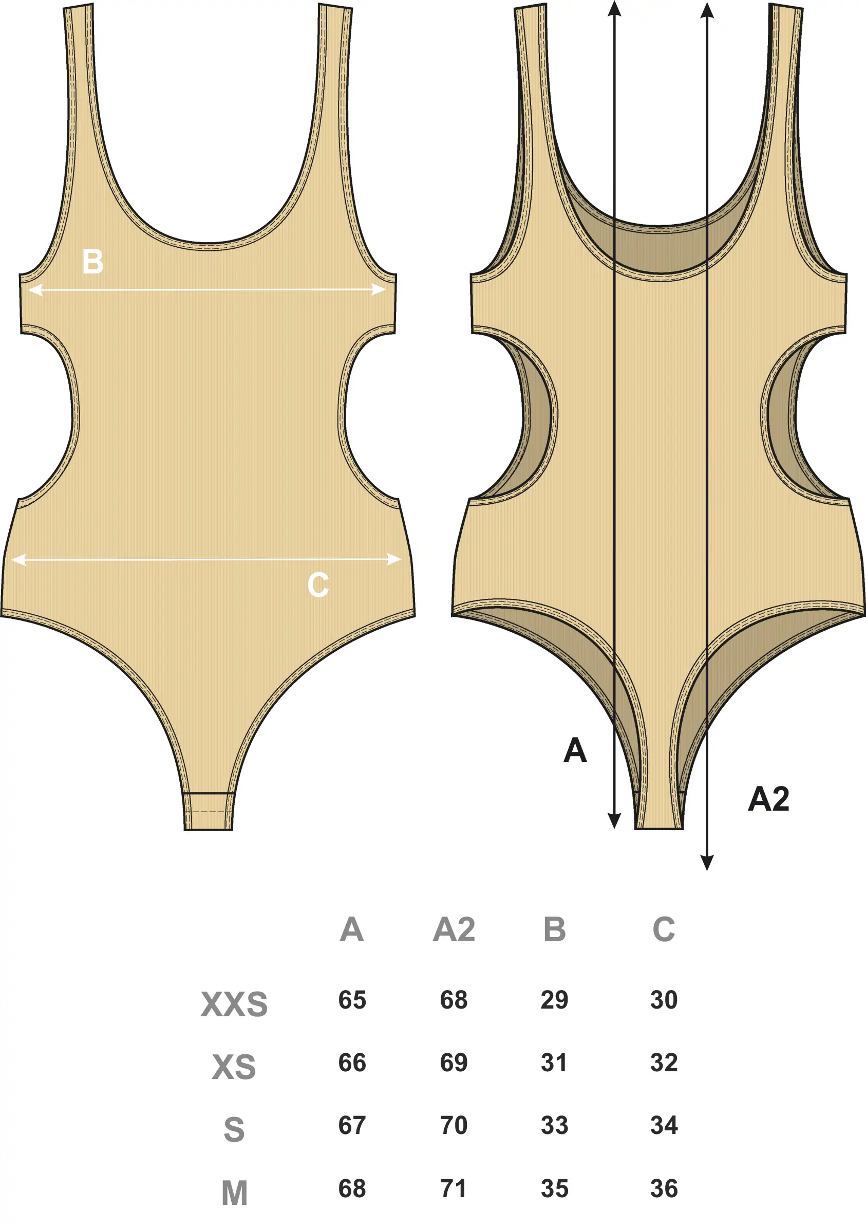 Боди фиксируется по низу тесьмой с кнопками, регулируемыми по росту — для среднего и высокого. Сзади выполнено по типу «бразилиана», обеспечивающему минимальное пролегание швов.