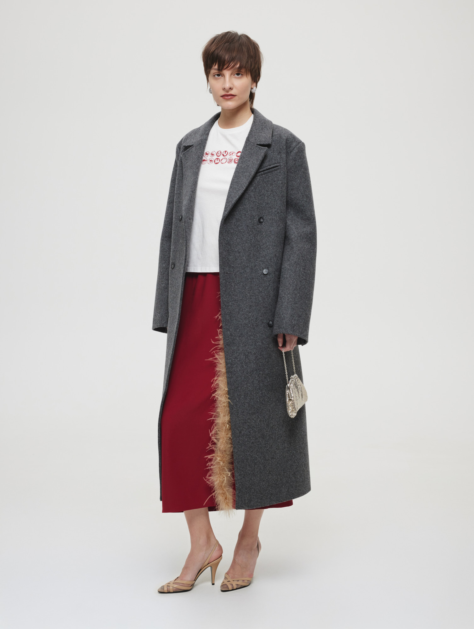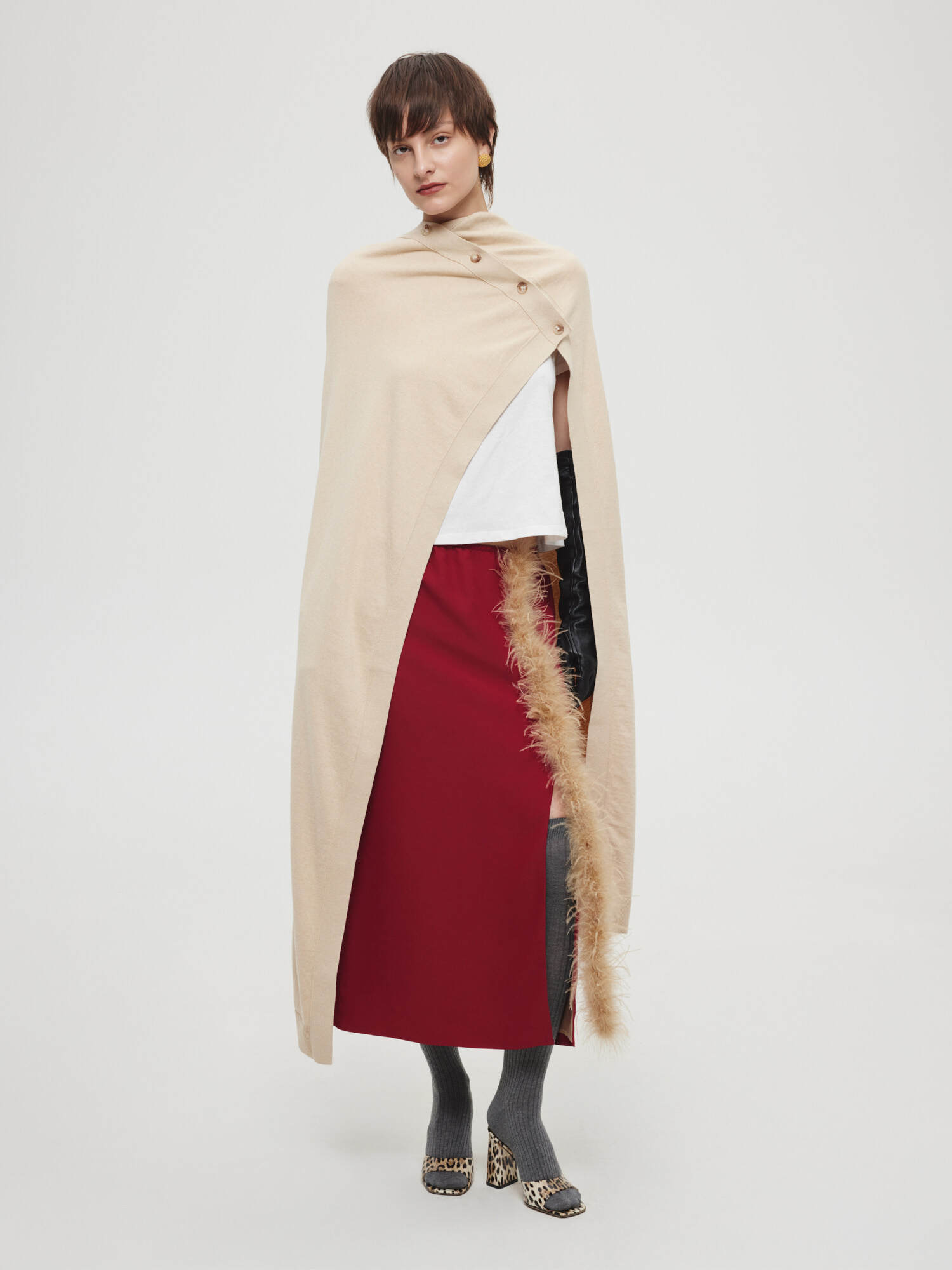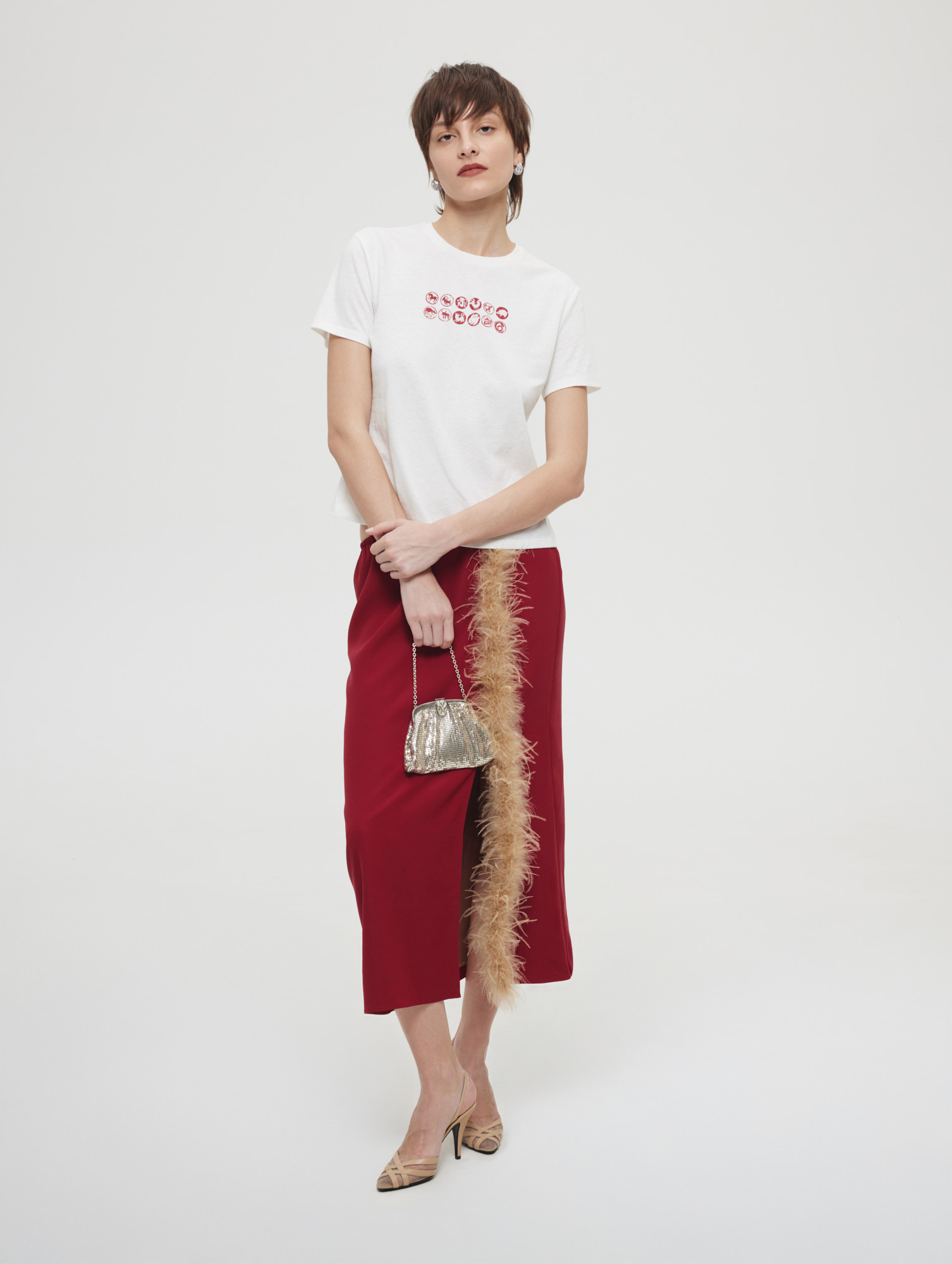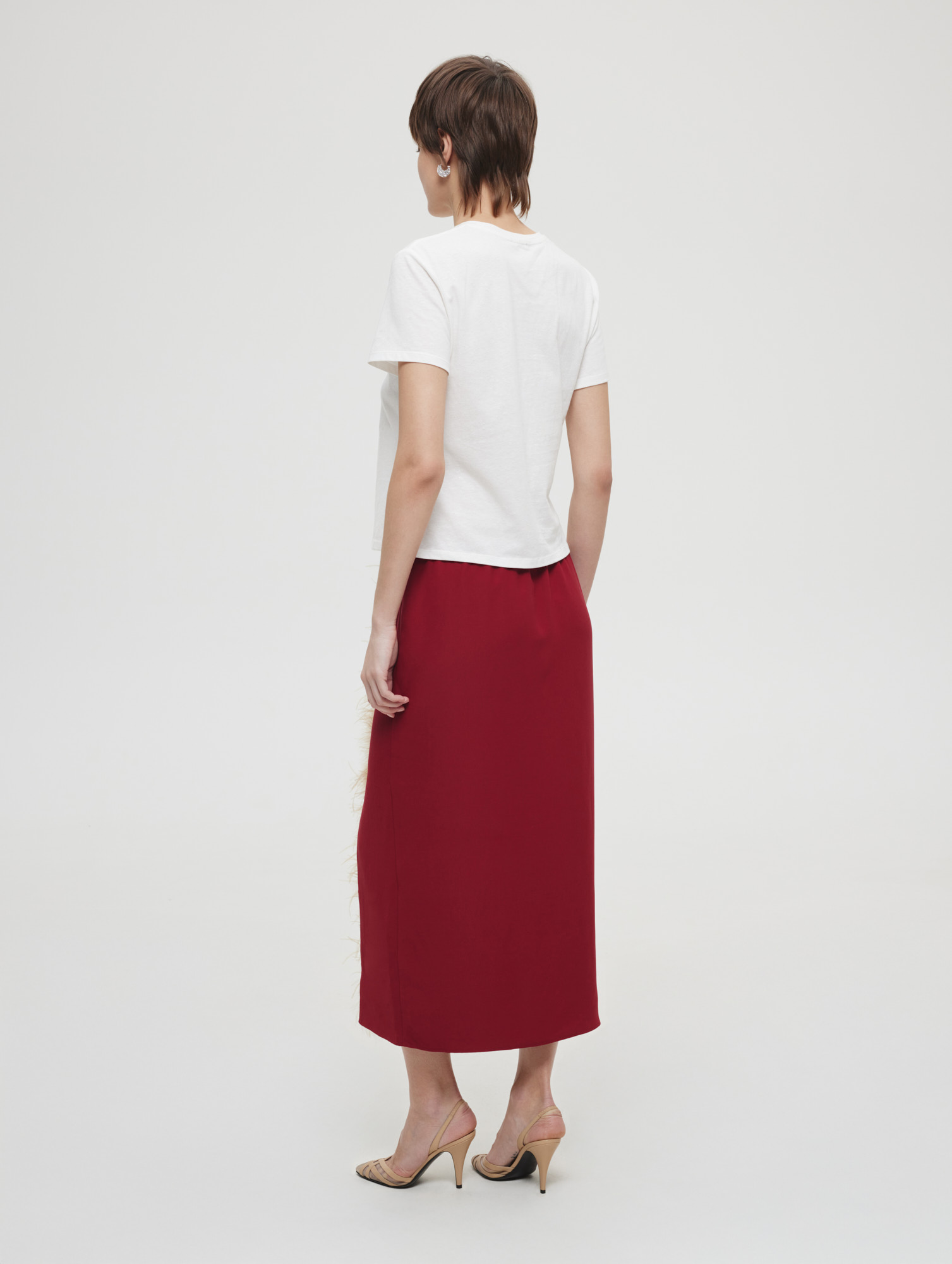 Интерпретация юбки La Dama в глубоком красном оттенке матовой струящейся ткани. Высокий асимметричный разрез дополнен съемным контрастным боа из перьев страуса, которое крепится на миниатюрные пуговицы. Внутри — полупрозрачный подклад в тон перьям.
