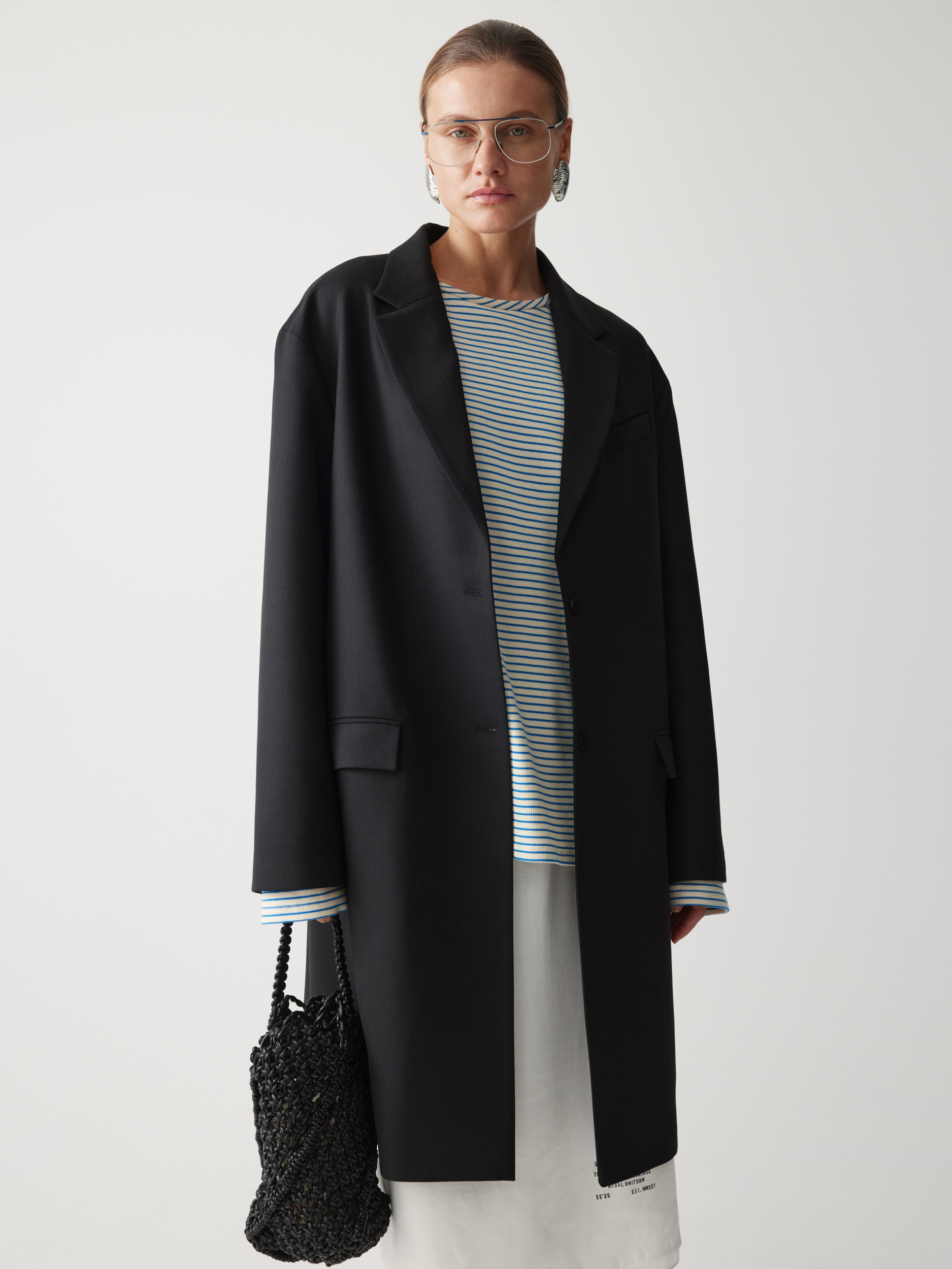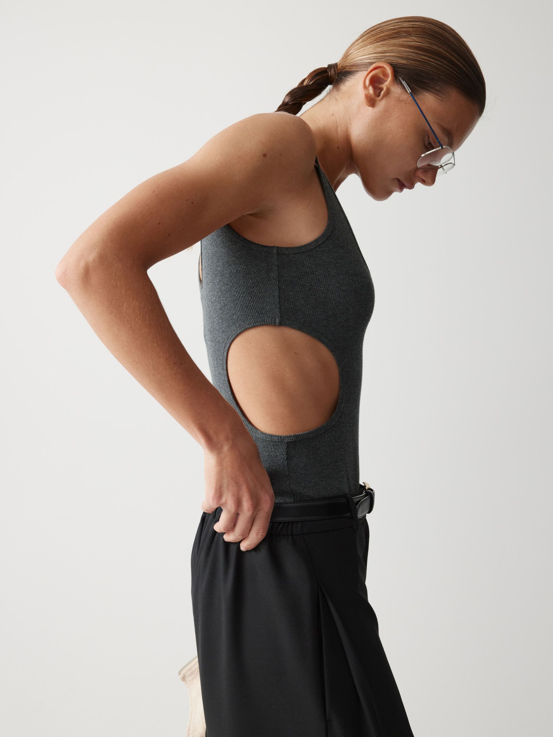 Рекомендуем сочетать с прилегающим боди глубокого серого оттенка, дополнив образ удлиненным пиджаком, или с объемным флисовым свитшотом, создавая контраст.
