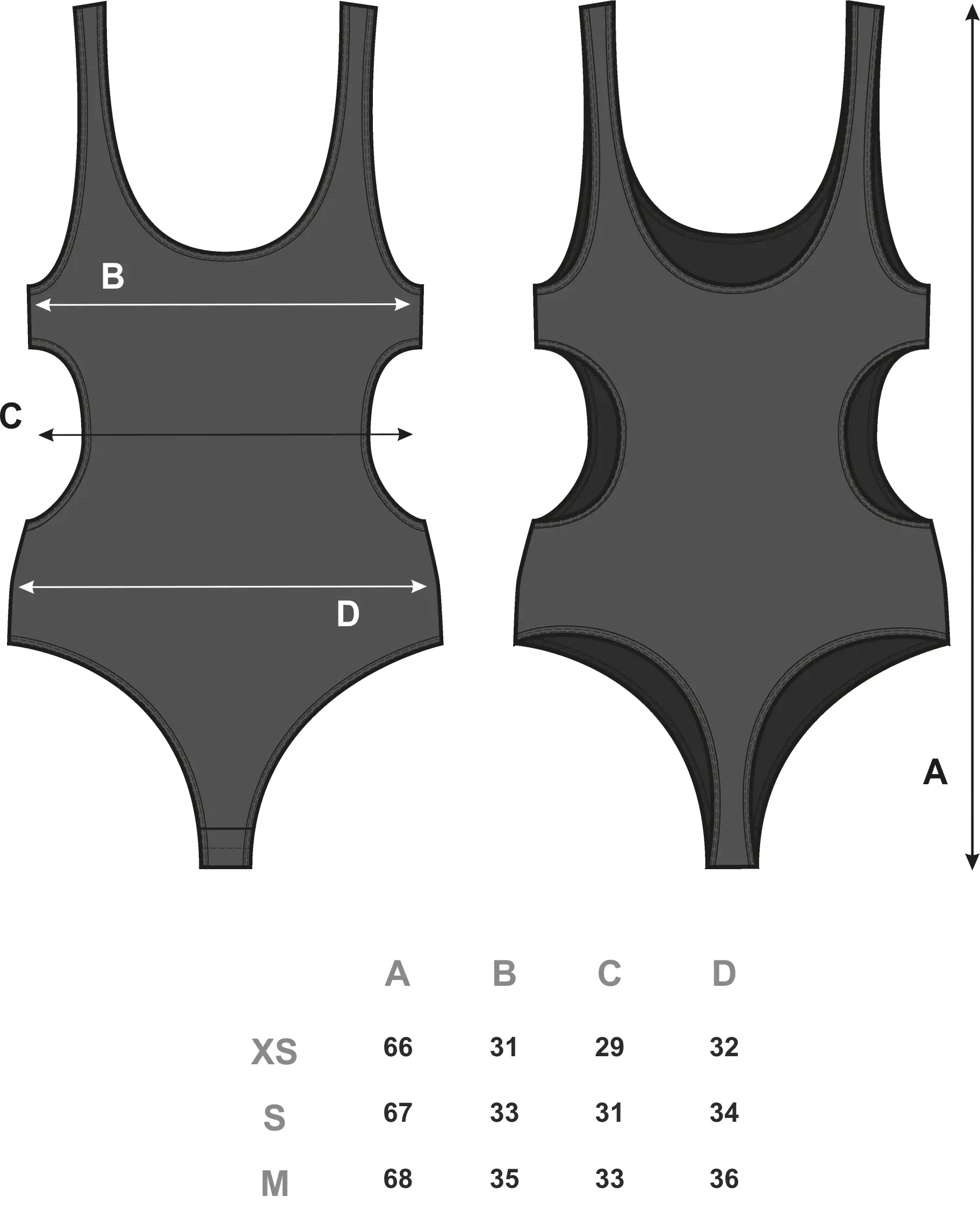 Боди фиксируется по низу тесьмой с кнопками, регулируемыми по росту — для среднего и высокого. Сзади выполнено по типу «бразилиана», обеспечивающему минимальное пролегание швов.