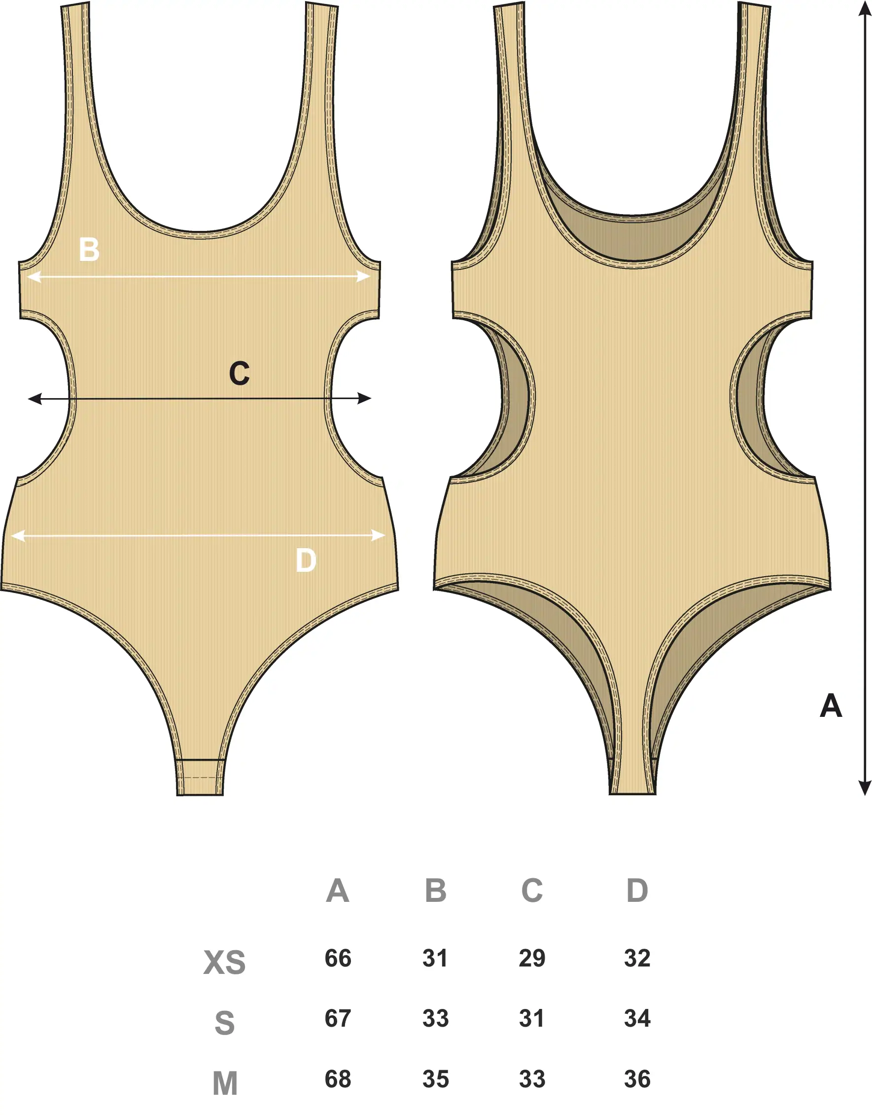 Боди фиксируется по низу тесьмой с кнопками, регулируемыми по росту — для среднего и высокого. Сзади выполнено по типу «бразилиана», обеспечивающему минимальное пролегание швов.